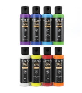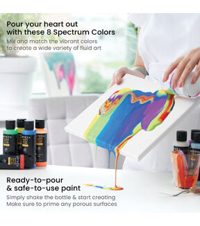 Painting is completely stress-free when you’re working with pouring paints. Arteza’s Pouring Acrylic Paints are pre-mixed and ready to pour, to save you the extra time. Their high-flow, water-based paints are easy to use, simply shake the bottle, pour your colors into a cup, then pour that cup onto your creative surface. Add unique patterns and designs to canvas panels, stretched canvases, wood slices, ceramic pieces, and more! Any and everyone is invited to join in on the fun of painting with pouring paints. Add every color of the rainbow to your pouring paint collection with Arteza’s Rainbow Spectrum Tones Pouring Acrylic Paint Set of 8. This must-have pouring acrylic paint set makes a wonderful introductory set since it includes every color needed to create vibrant works of art: yellow, orange, red, light blue, neon blue, purple, green, and white. Explore all of the different pour painting techniques with this plentiful acrylic paint set. Take on countless paintings with this set of high-flow, water-based, pre-mixed pouring acrylic paints! Produce colorful paintings effortlessly with this Rainbow Spectrum Tones Pouring Acrylic Paint Set.