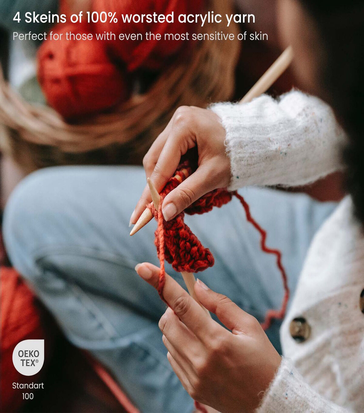 Knit, crochet, and craft the projects of your dreams with our Yarn 4-Pack. Our yarn is perfect for beginners, and experienced fabric crafters alike. This plentiful pack of 4 features a cohesive and beautiful color scheme, perfect for your next big project. Design scarves, blankets, mittens, hats, and so much more with this well-crafted yarn. Each skein in our Yarn 4-Pack is 100% worsted acrylic yarn, which is known for being an incredibly versatile, medium weight fabric. Worsted yarn is perfect for various knitting and crochet crafts, and with each skein being 200g, you won't have to worry about running out mid stitch. Additionally, this acrylic yarn is Oeko-Tex 100 Certified, meaning it is safe to use for baby clothing and sensitive skin.