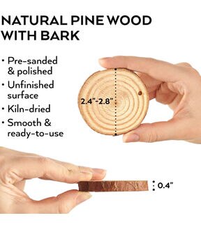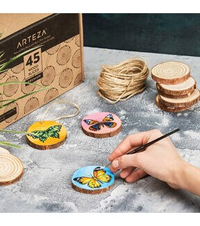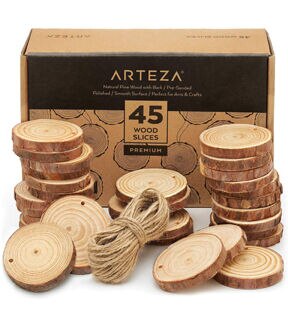 Create artwork and craft pieces on one of the most versatile surfaces around: Wood Slices! Arteza’s premium Wood Slices can be used for arts and craft projects, DIY projects, paintings, and wood-burnings. Each wood slice (made of natural pine wood with bark) arrives pre-sanded, polished, and ready to use. Their versatile nature and smooth surface invites you to explore countless artistic techniques, including decoupage, wood-burning, string art, painting, acrylic pouring, and resin art. When working with polished wood slices the creative possibilities are only limited to your imagination! Invite more creative curiosity into your life, start by investing in a set of budget-friendly, premium Wood Slices. Craft and create with the natural surfaces featured in Arteza’s Premium Wood Slices Set of 45. This versatile set of wood slices includes 45 pre-sanded, natural pine wood, polished wood slices that are each 0.4 in thick with a 2.4 - 2.8 in diameter. Their miniature nature makes these wood slices ideal for countless DIY and arts and craft projects. Craft your own coasters or miniature art series with this versatile set of kiln-dried, ready-to-use wood slices. Regardless of your medium of choice, you’re sure to make amazing use of these unique wooden surfaces. Create like never before with this Wood Slices Set!
