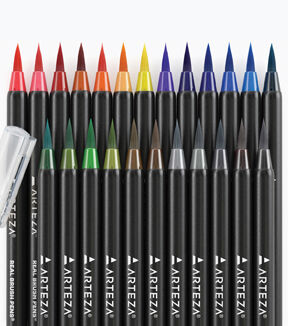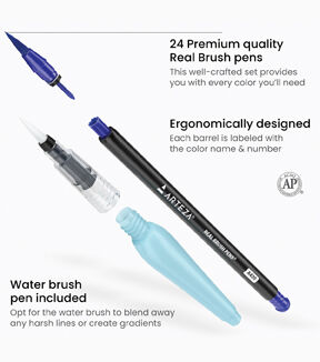 Enjoy the wide range of colors offered in this set of 24 Real Brush Pens and use these versatile tools to produce a variety of vibrant watercolor artwork. The flexible nylon brush tip allows you to apply a painterly touch to all of your pieces. Use the very tip of the nib with a light hand to create precise lines. If you’re looking to create more heavy-handed strokes, apply pressure as you sketch or color to create bold lines. No need to use a water cup; these pens offer the same blendability as watercolors without the typical mess. Sketch your piece directly onto watercolor paper and blend the colors with just a little bit of water. Use the included water brush pen or opt for paintbrushes dipped in water to blend away any harsh lines or create gradients.
