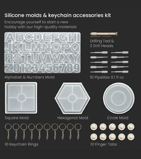 Arteza’s Silicone Molds and Keychain Accessories Kit makes the perfect introductory set! Our affordable and high-quality molds make a great introduction to people who simply want to try out resin with smaller projects, and those who enjoy making small keychains to give as gifts. Although our silicone mold sets are popular for epoxy resin, these size molds are also great for making travel soaps. This Silicone Molds and Keychain Accessories Kit provides plenty of options such as a circle, square, and hexagon; create more personalized keepsakes with an alphabet/numbers mold. One of the most useful additions to this kit is the keychain accessories—with an included hand drill and enough rings to create ten keychains, creators can enjoy spending more time perfecting their pieces.