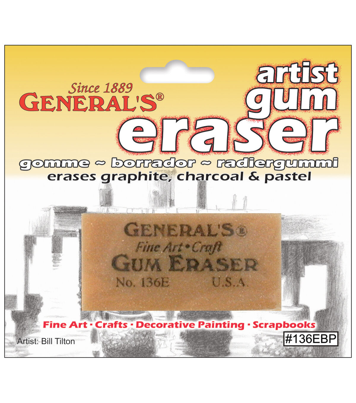 This classic soft eraser is ideal for erasing smudge marks and pencil lines on mat boards; fine papers; watercolor paper; and more. Perfect for use with graphite; pastel; and charcoal pencils. This package contains one 2x1x3/4in gum eraser. Made in USA.