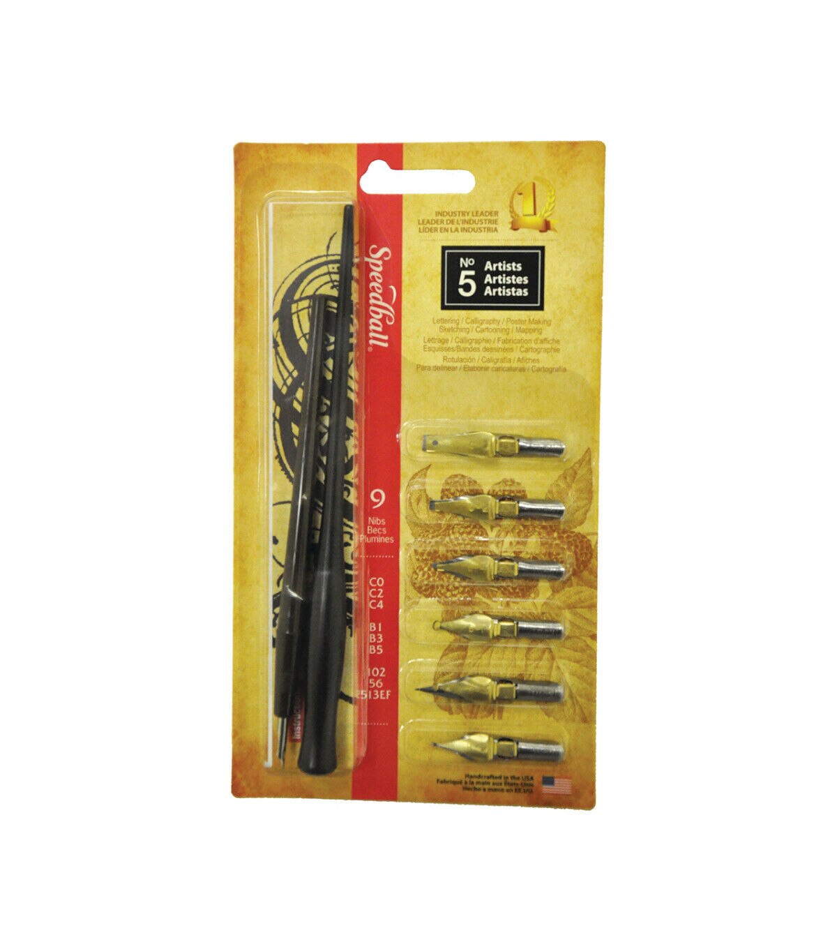 Contains six Speedball pens, penholder, Hunt #102 crow quill pen, Hunt drawing pens #56 and #513, and a pocket size lettering and drawing folder.