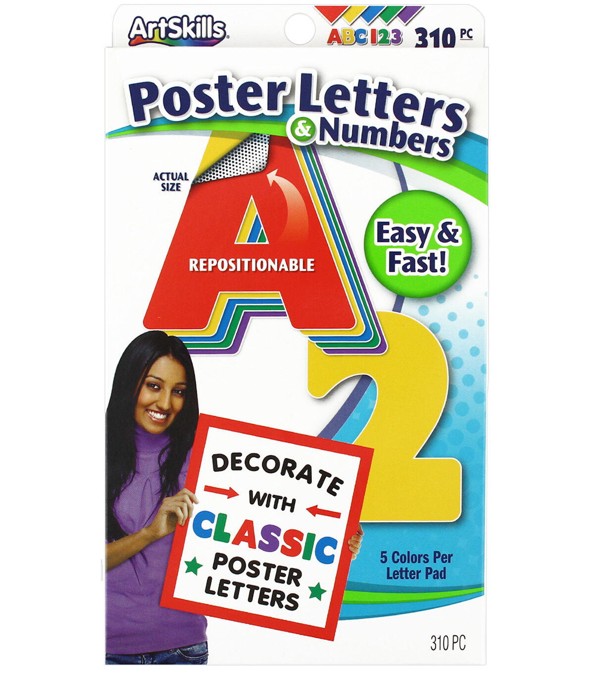 Create projects that stand out using the ArtSkills Poster Stickers-Letters & Numbers. This pack contains 310 pieces of assorted and repositionable poster letters and numbers that will add glam to any project. They are ideal for school projects, poster boards, yard sale signs, event signs and more. These stickers come in an assortment of colors, giving you options to choose from. They feature easy application with peel-and-stick repositionable back.