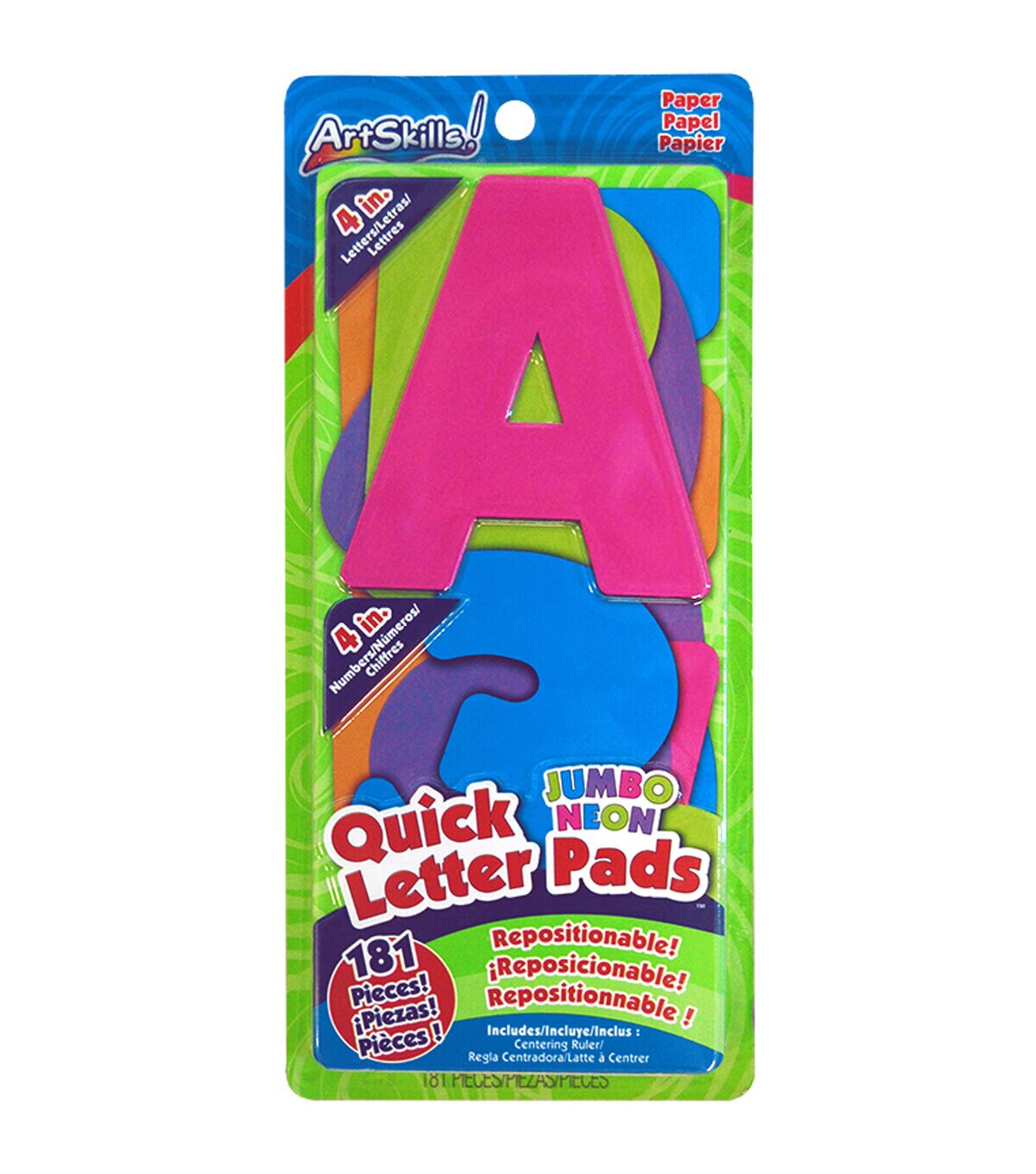ARTSKILLS-Quick Letter/Number Pads Repositionable With Centering Ruler. This set features a variety of letters, numbers and symbols that will make your poster stand out and look great. This package contains a total of 180 pieces between the letters, numbers and the ruler. Design: Neon Colors Jumbo 4 inch. Imported.