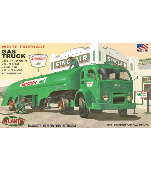 1/48 Scale. This kit was originally released in 1956. Features detachable trailer, tilting front cab with detailed engine and interior, detailed chassis, opening gas compartment doors on trailer and 2 figures with sign. Comes with Markings for Sinclair and US Army gasoline tanker. Clear parts are included for the windows. Features 61 parts Molded in green and clear. Measures 10.25 inches long. Skill level 2.