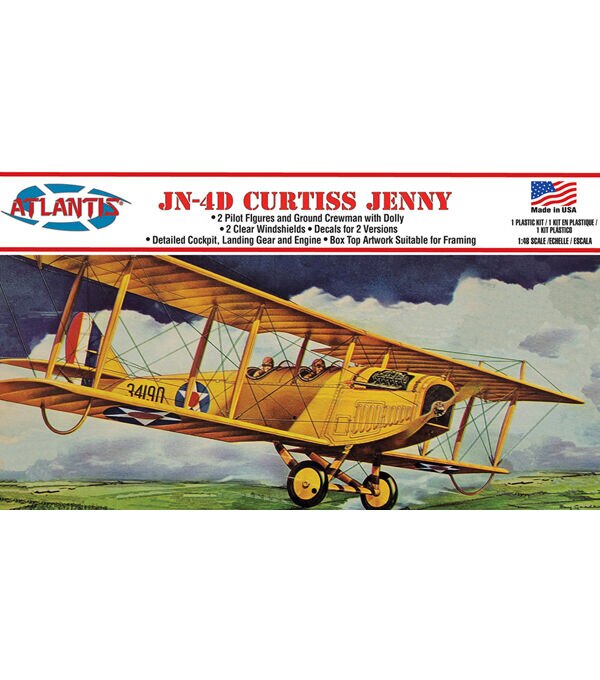 1/48 Scale. Features 2 Pilots with ground crewman and dolly, detailed engine, cockpit and landing gear. 2 decal options including scheme from the Aurora Barnstormers. Molded in Metallic barstormers Green color. Classic boxart by Ray Gaedke. Officially Licensed.Please note: the 2 very small clear parts are in the main bag of parts. Check the bag carefully and set them aside to assure you do not lose them.The Curtiss JN "Jenny" was a series of biplanes built by the Curtiss Aeroplane Company of Hammondsport, New York beginning in 1915. Although the Curtiss JN series was originally produced as a trainingaircraft for the US Army, the "Jenny" (the common nickname derived from "JN") continued after World War I as a civil aircraft, and it became the backbone of American postwar civil aviation. Pilots foundthe Jenny's stability and slow speed made it ideal for stunt flyingand aerobatic displays in the barnstorming era. Many Jenny's have been restored and are on display in Air Museums all across the nation.