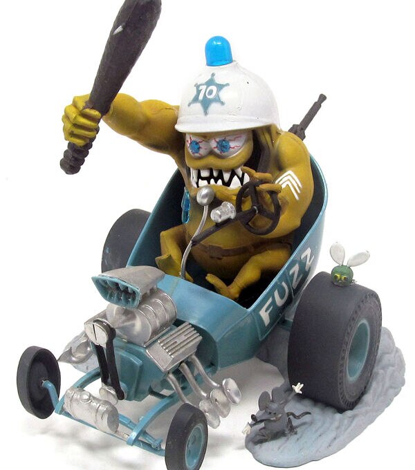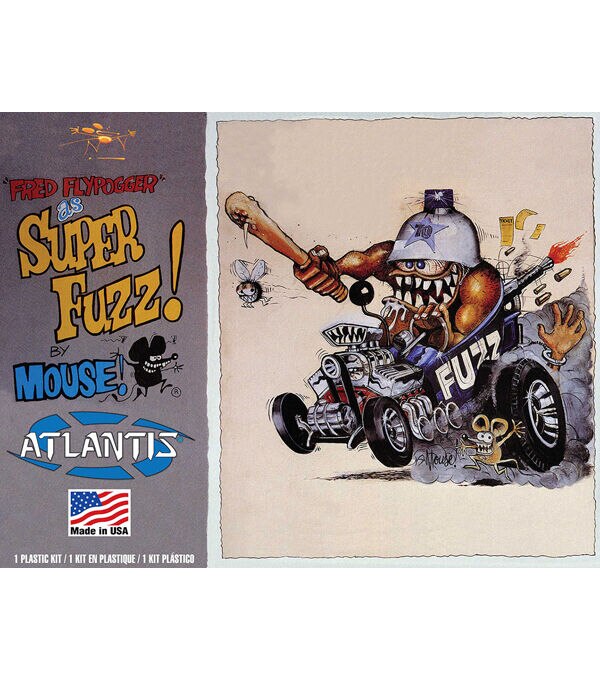 Superfuzz Fred Flypogger himself as a happy friendly lawman. Dig him with his drool in his supercharged prowl car, complete with persuader, machine gun and handcuffed culprit, but still looking for bad guys. This humorous figure stands 6 1/2 inches high with 'gumball machine' helmet, exhaust smoke cloud, and the little signature Mouse up front. Eyes can be positioned anywhere to change expression. This kit does NOT come with decals-it never did- but the markings are outlined on the model kit for easy painting.