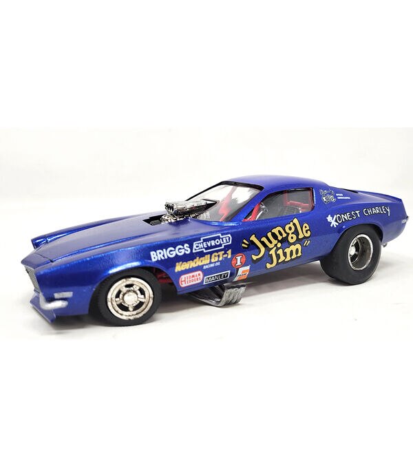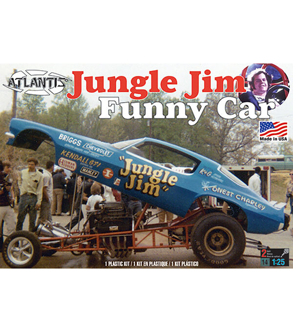 1/25 Scale. This kit has been restored back to the original configuration complete with 2 engines. We also have updated the tires. Comes molded in white, clear and chrome with updated authentic Jungle Jim decals and artwork. Features 1 Piece Camaro style Funny Car body, 2 engine options 426 Hemi or FoMoCo 427 engine, Tubular chassis with rollcage, and hinged body. Includes retro instructions. Skill level 2.