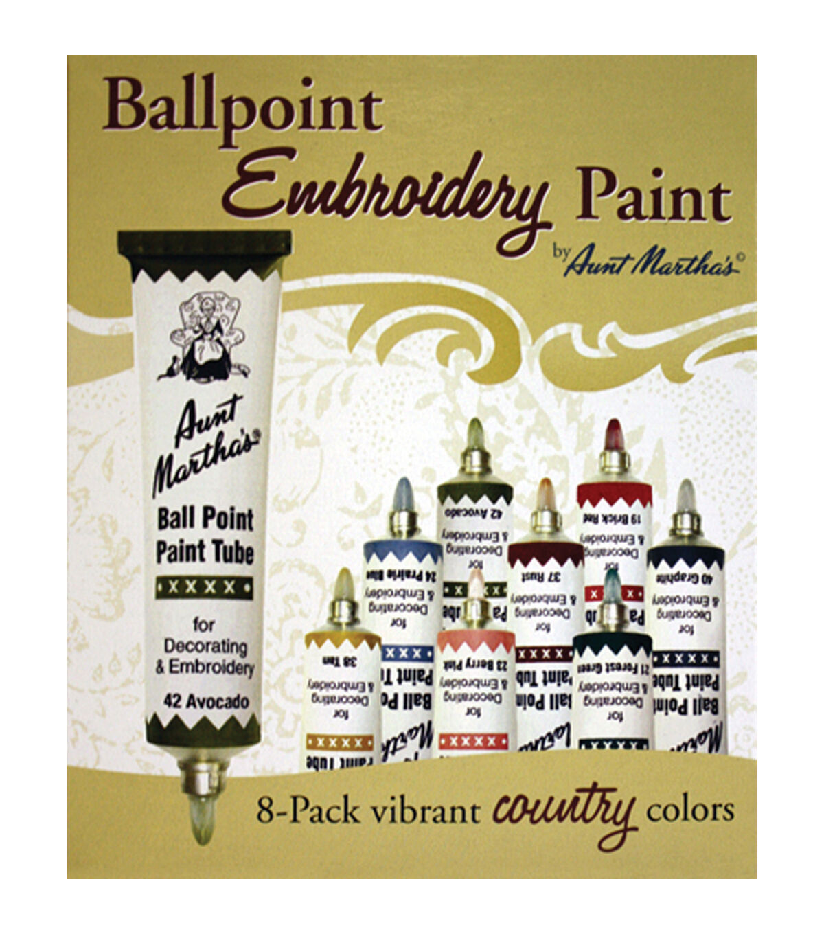 AUNT MARTHA'S-Ballpoint Embroidery Paint. Get creative and use these tubes of paint for any project-- ornaments, unique jewelry, personalized gifts, wearable art, quilt block embellishments, tea towels, tablecloths, pillowcase, and so much more. It works on fabric, wood, leather, plastic, metal, and glass. Each tube has a self-sealing ball point tip that can be used for line drawing and shading, or removed for painting with a brush. The oil-based paint is permanent, washable, lead free and non-toxic. This package contains eight 1-ounce tubes of paint in country-inspired colors. WARNING-FLAMMABLE-Keep away from heat or flame. Conforms to ASTM D4236. Made in USA.