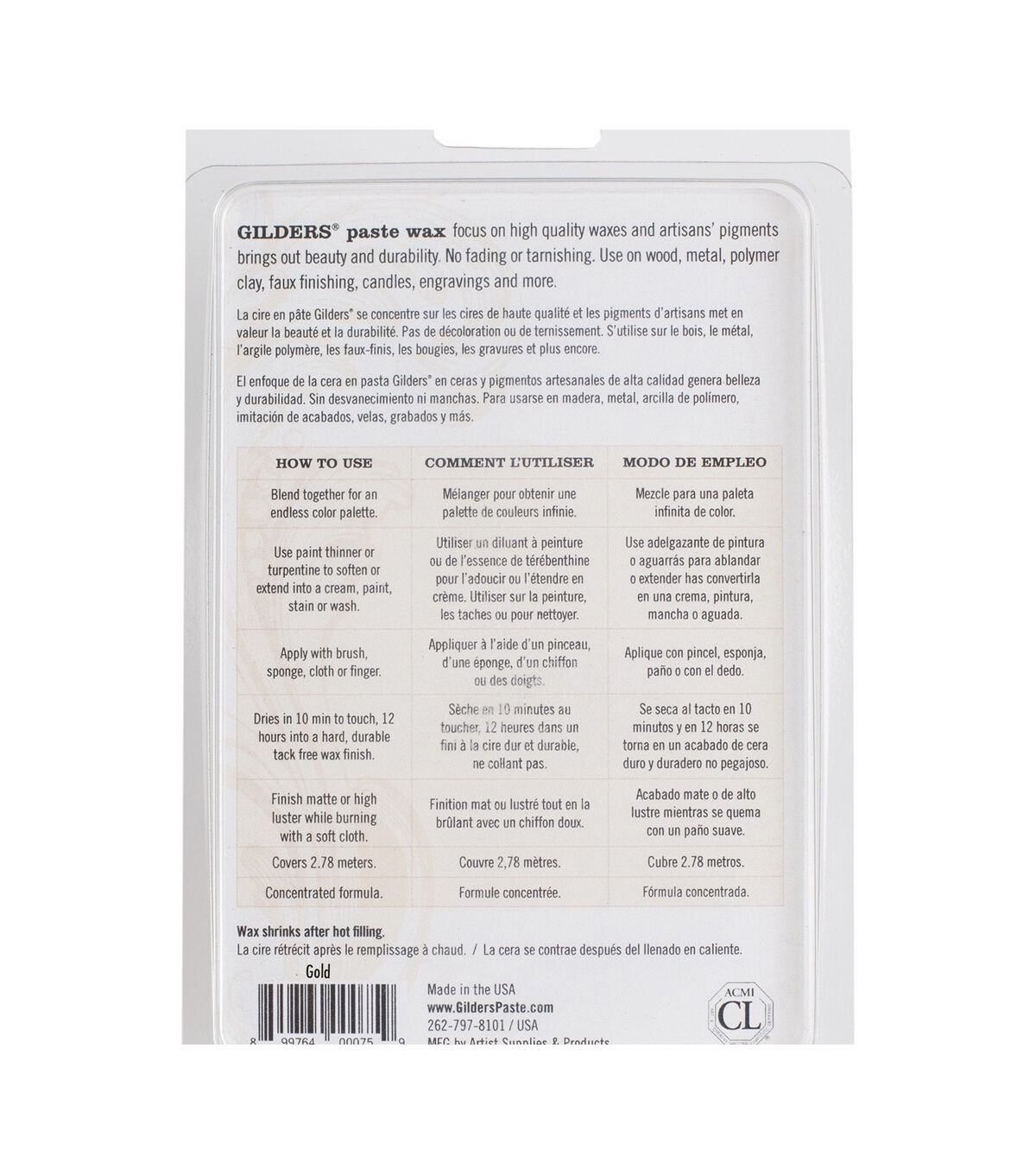 Let the glowing metallic or vivid jewel-like tones of these innovative, decorative, non-tarnishing pastes transform picture frames, furniture, metalwork, artwork, molding, ceramics, textiles or almost any clean dry surface. This paste is made of highly concentrated metallic and organic pigments blended with a wax base. Can be used indoors or outdoors. This 4.5x6.75x1 inch package contains one 1ox container of gilders paste wax and three stir sticks. Conforms to ASTM D4236. Made in USA. Cannot ship outside Continental US.