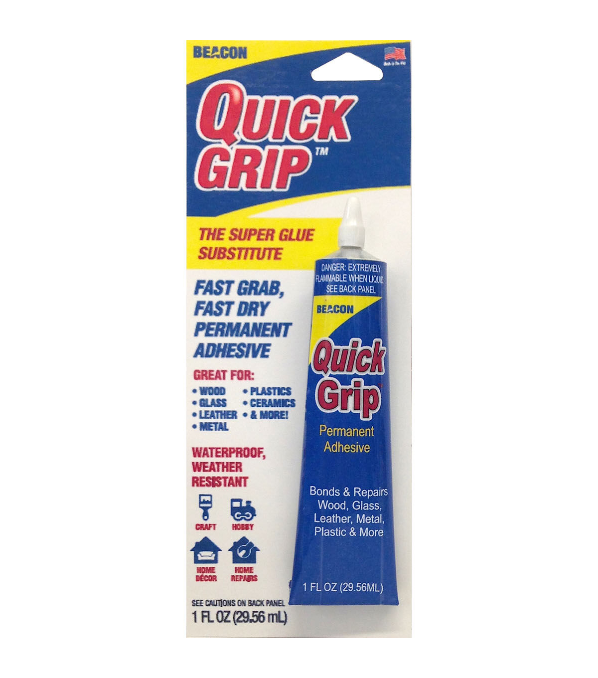 Beacon-Quick Grip Tube. This permanent glue bonds jewelry, plastics, metal, wood, glass, leather, ceramics and more! This package contains 1oz of quick grip glue. Acid free. Conforms to ASTM D4236. Made in USA.