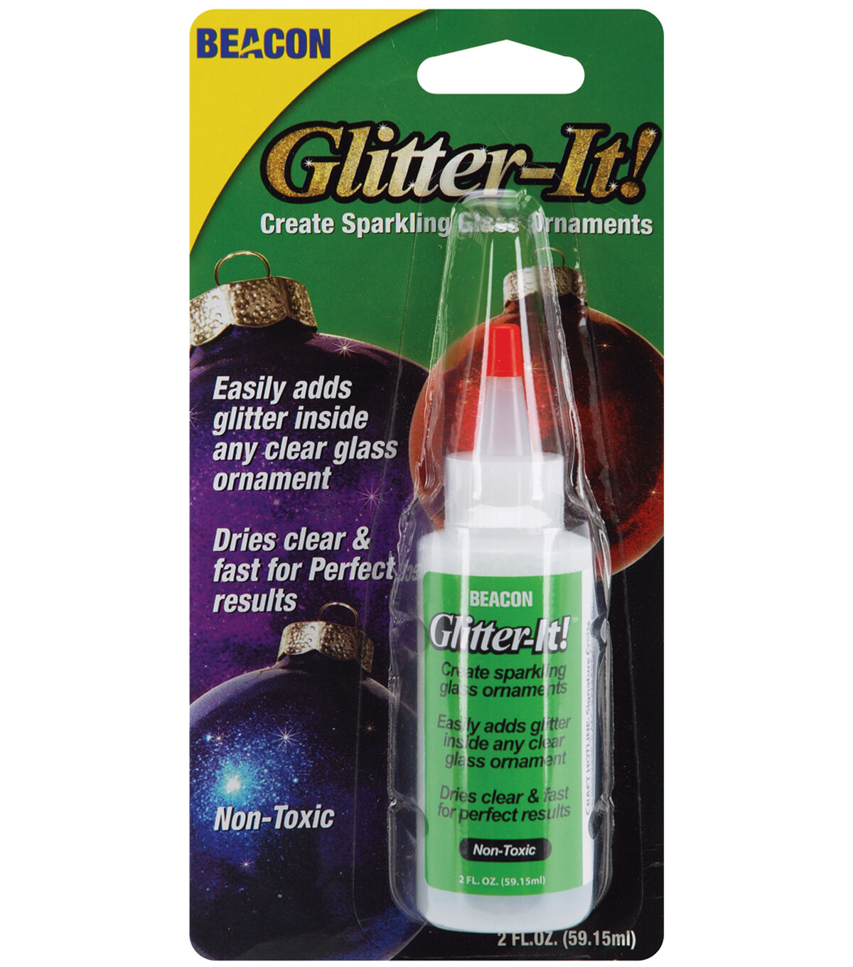 Make sparkling craft projects or festive ornaments using the Beacon Glitter-It! Adhesive 2oz. Simply add this glue inside any clear glass or plastic ornament of any shape to add a glittery touch. The clear glitter glue dries fast and is also easy to clean up with just water and soap. This pack includes one 2-ounce bottle of non-toxic glitter glue.