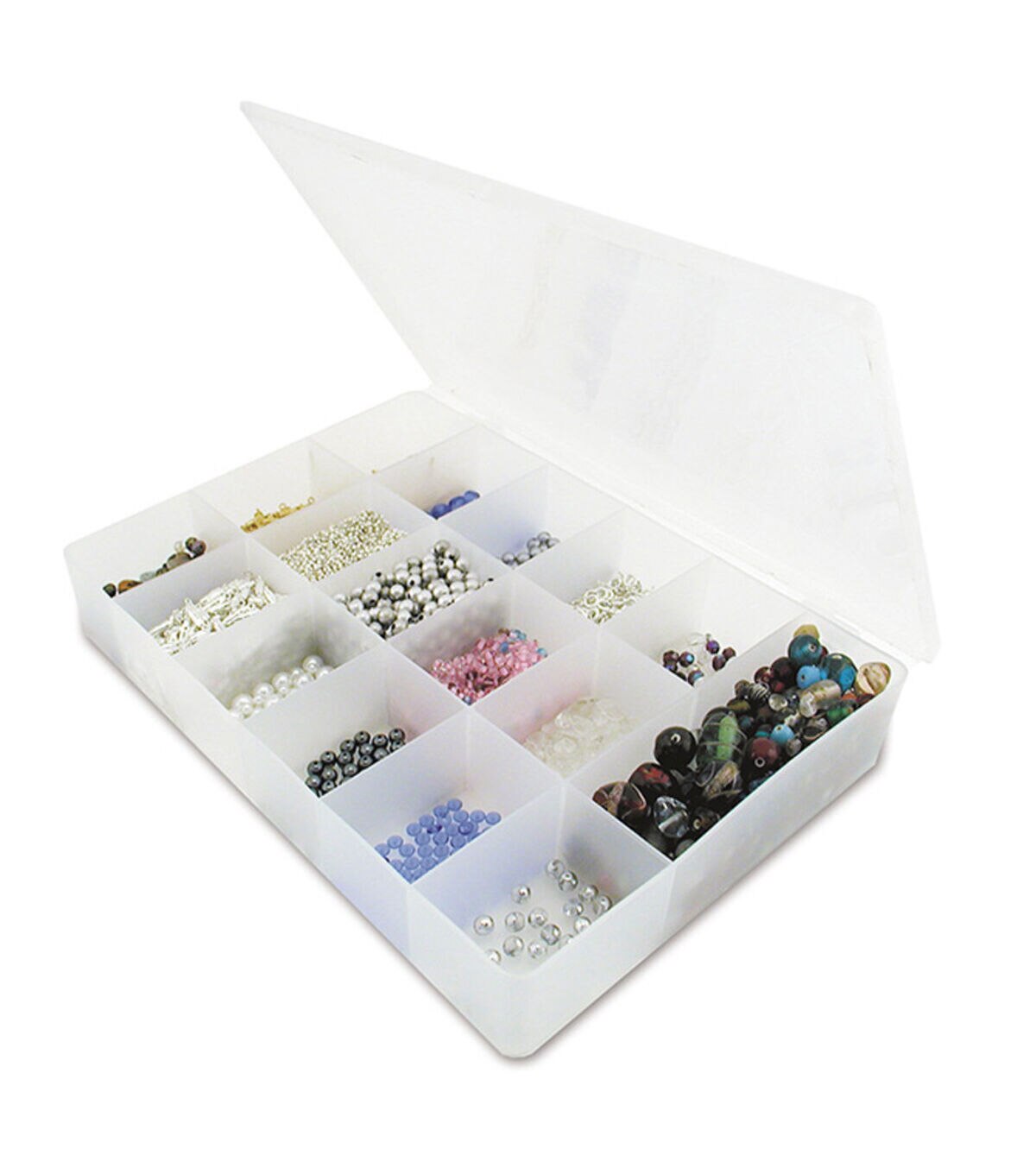 Store, transport, and organize all your beads and findings in this handy storage container. Divided compartments with hinged lids close tightly to prevent mixing of parts or unexpected spills.