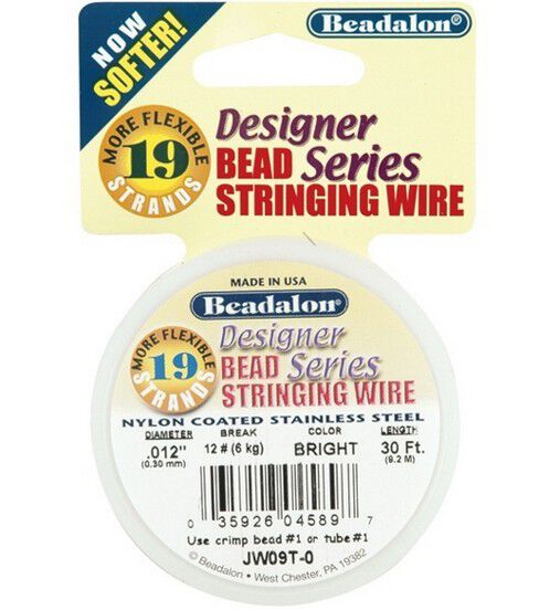 Beadalon wires are softer, more supple and stronger than any other bead stringing wires on the market. They combine the soft, silky feel of thread with the strength and abrasion resistance of stainless steel. Multiple strands of incredibly strong fine stainless steel cable is nylon coated specially for bead stringing. The higher number of strands in the wire, the more flexible and kink resistant. For Austrian crystals, seed beads and fresh water pearls use 0.012" and use 0.015"-0.018" for medium to heavy glass, metal, ceramic and fiber-optic beads.