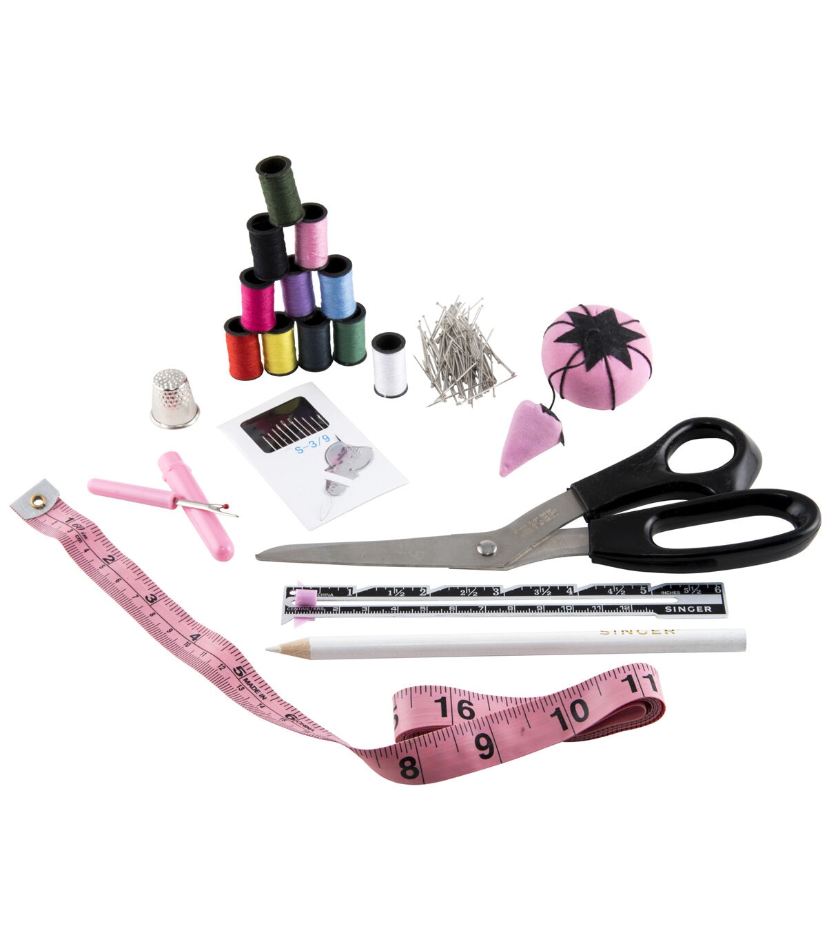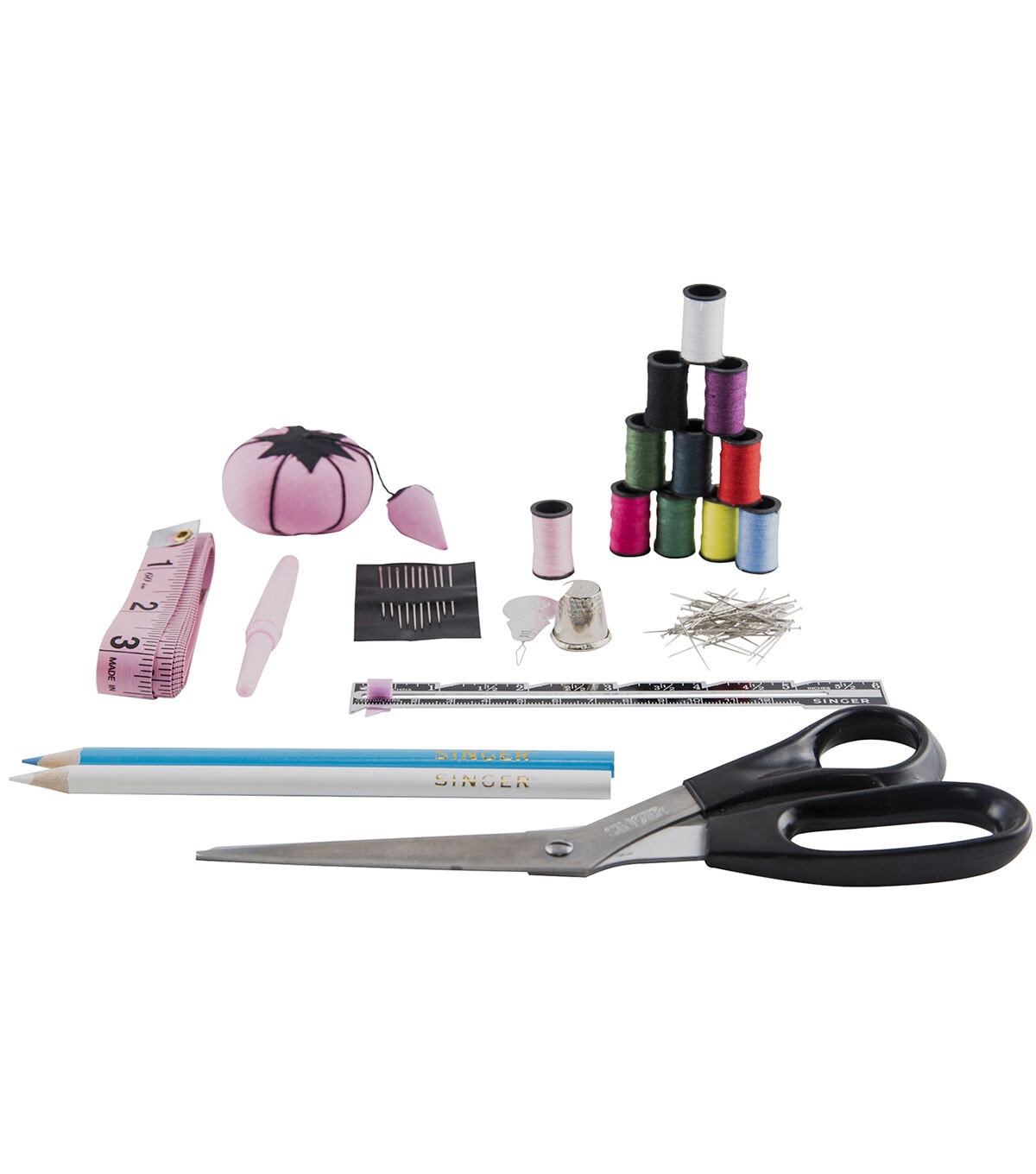 The Singer Beginner's Sewing Kit will be a perfect gift for someone who is beginning their sewing or crafting journey. It is complete with all the basics necessary to mend small rips and tears in clothing or begin a craft project. This sewing kit includes fabric scissors and two marking pencils, making it ideal for those interested in tailoring and making clothing. This kit also includes 11 assorted spools of polyester thread, 10 yards each, a seam ripper, tomato pincushion, measuring tape, 100 dressmaker pins, 10 hand needles, a thimble, a sewing gauge and one needle threader.