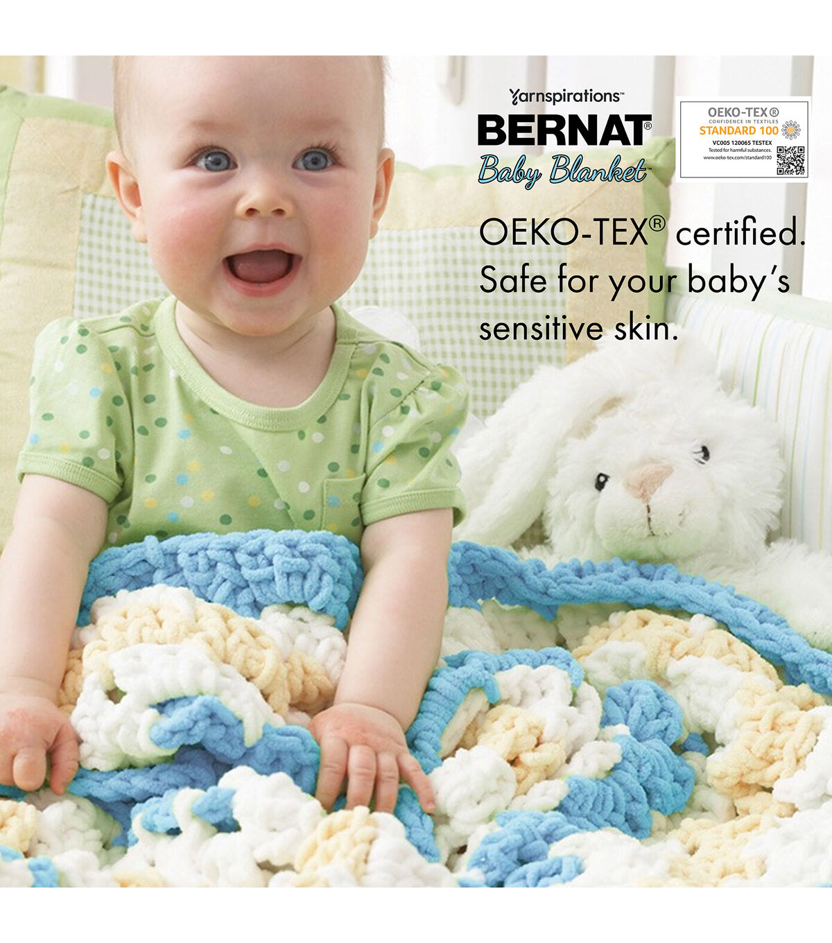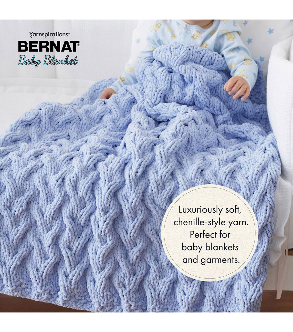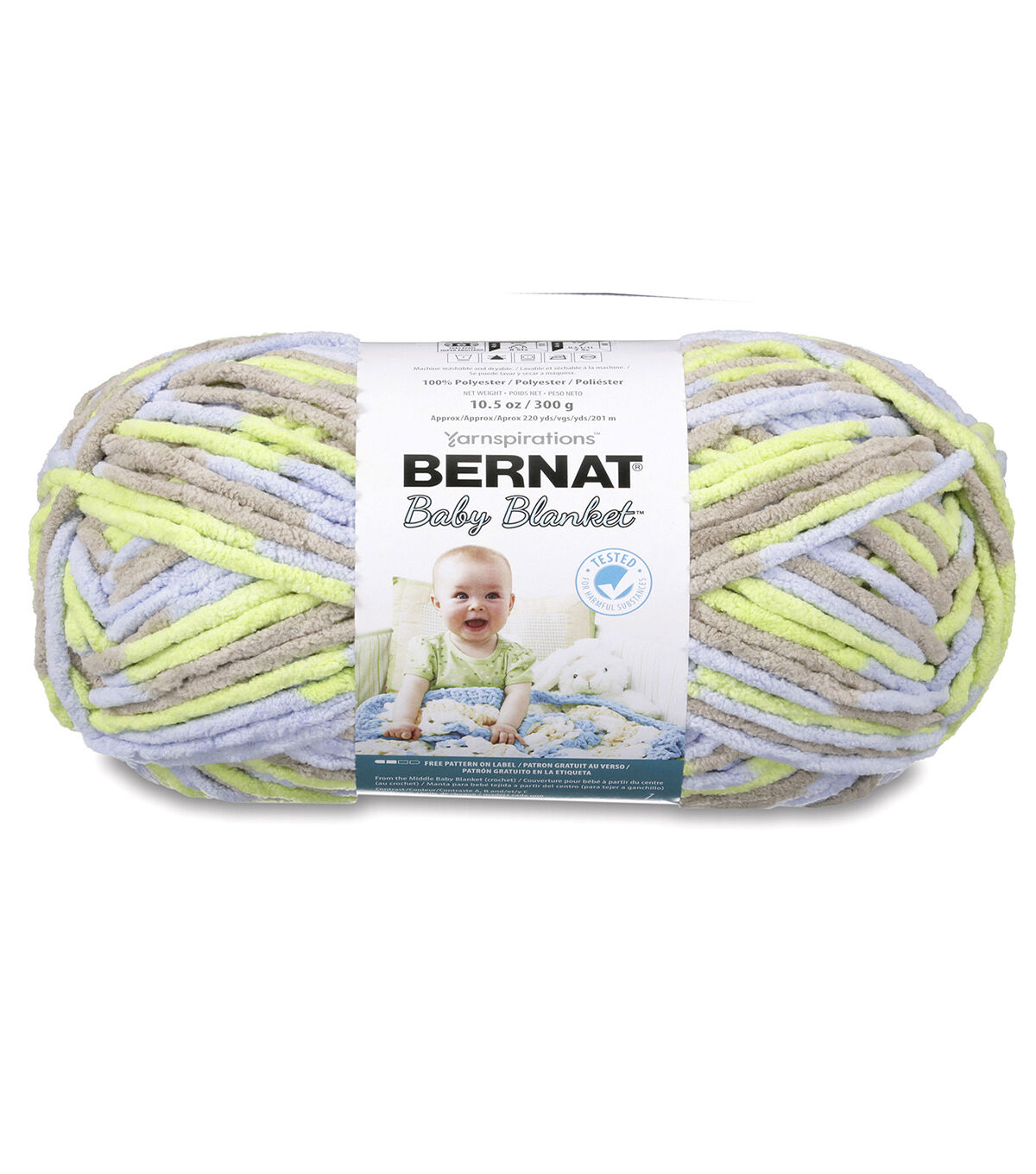 A luxuriously soft, chenille-style yarn that's perfect for baby blankets and garments. This machine washable and dryable yarn is the perfect versatile yarn for Baby. The big gauge makes projects fly by. Bernat Baby yarns are OEKO-TEX certified, and are tested for over 300 harmful substances and proven to be safe for your baby's sensitive skin. Make a project in every shade!