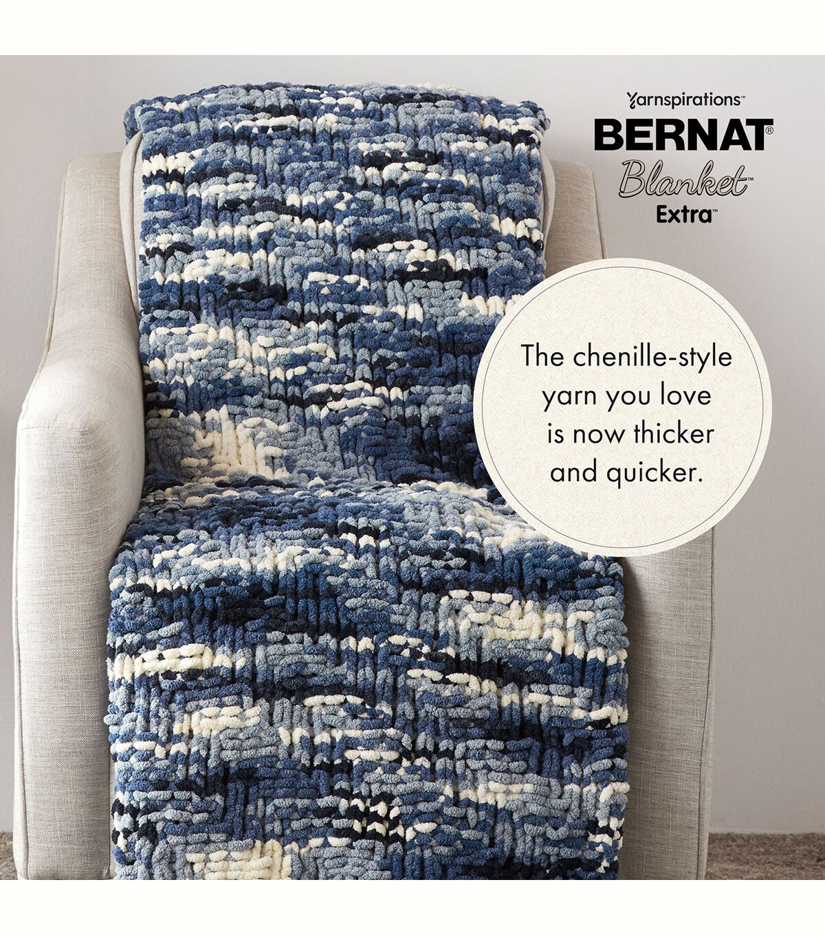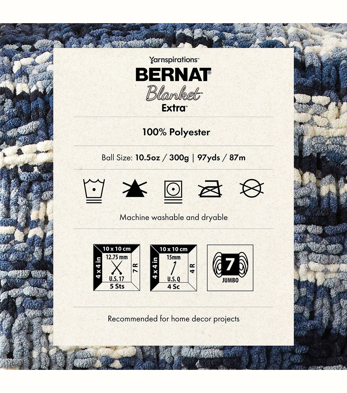 The jumbo weight version of one of our most popular yarns, Bernat Blanket Extra will quickly work up wonderful accents for your home. A must-have for anyone who loves their yarn super soft and squishy, you’ll love cuddling up with projects made with this chenille style yarn. Better yet, Bernat Blanket Extra is machine washable and dryable for easy care.