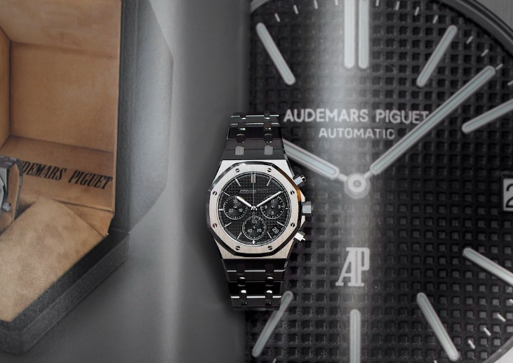 DIAL: Black dial with “Grande Tapisserie” pattern, black counters, white gold applied hour-markers and Royal Oak hands with luminescent coating.