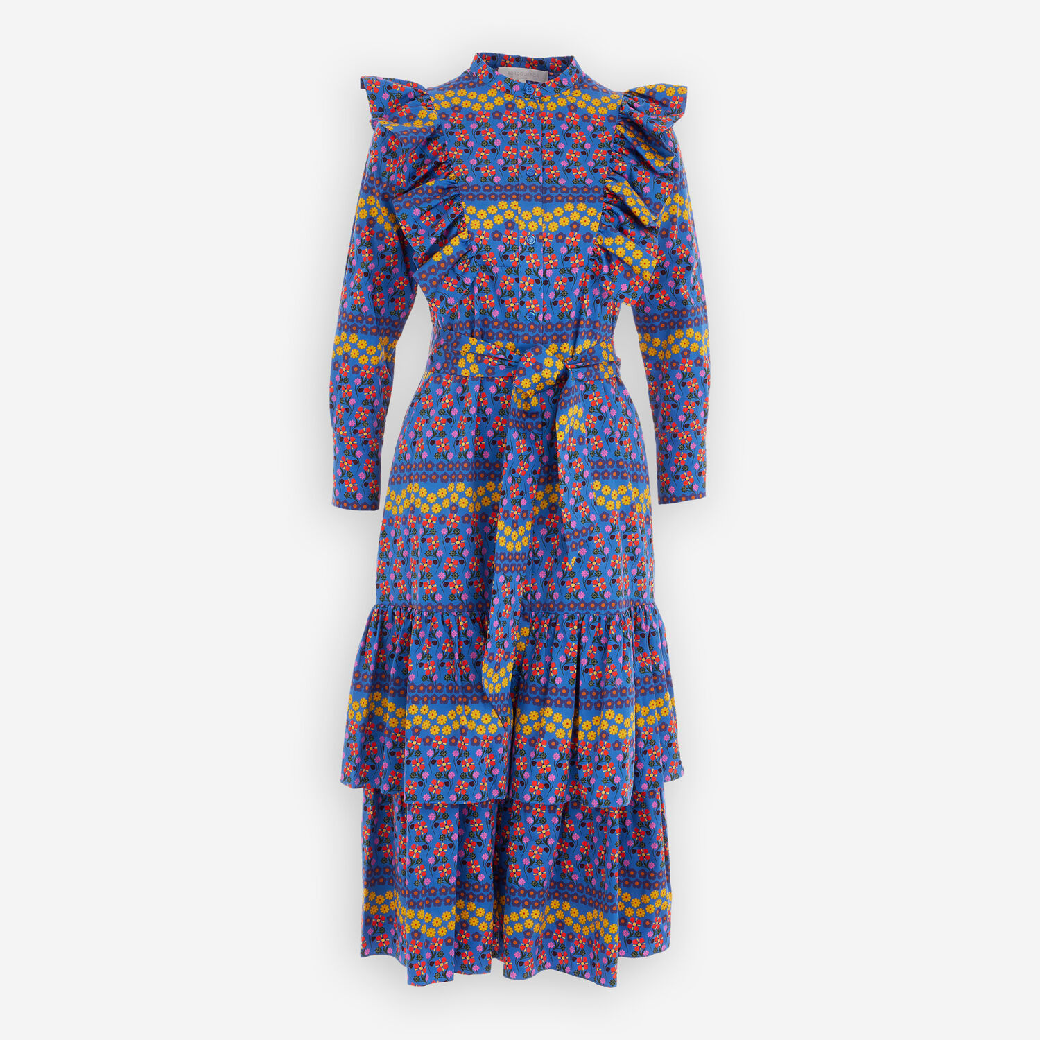 • Blue Floral Frill Bib Midi Dress