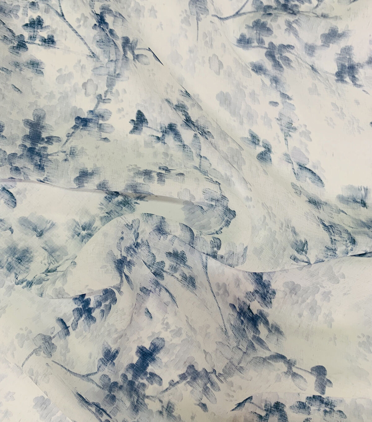 Spring blue flowers for calm and breezy apparel. The gossamer fabric is made of polyester that softly floats; perfect for airy apparel. It's also durable and breathable, so you can stay comfortable plus fashionable in formalwear, without worrying over wear and tear. From exciting prom dresses to glamorous nights out with friends, grab this fabric for you and your sewing to look your best.