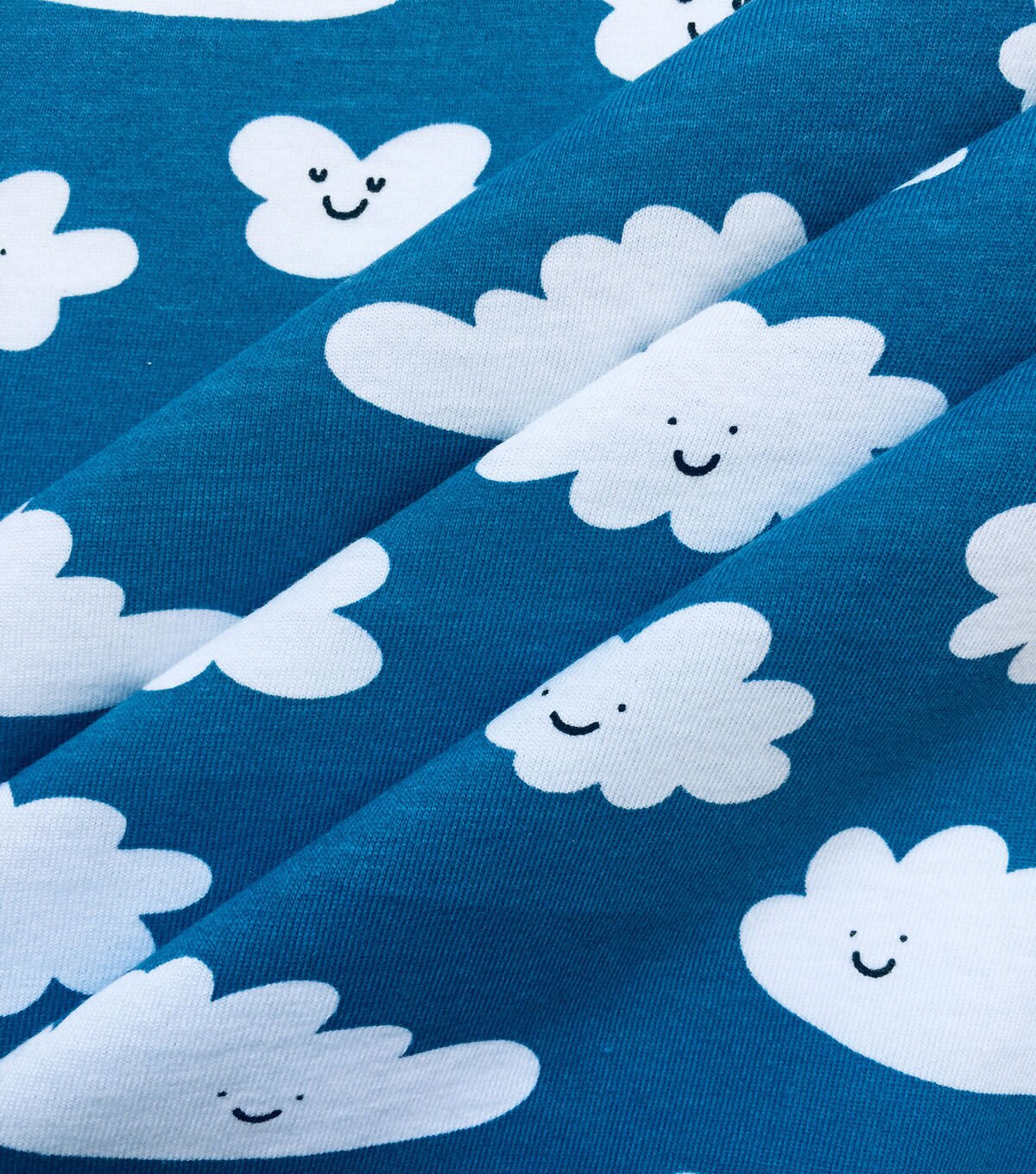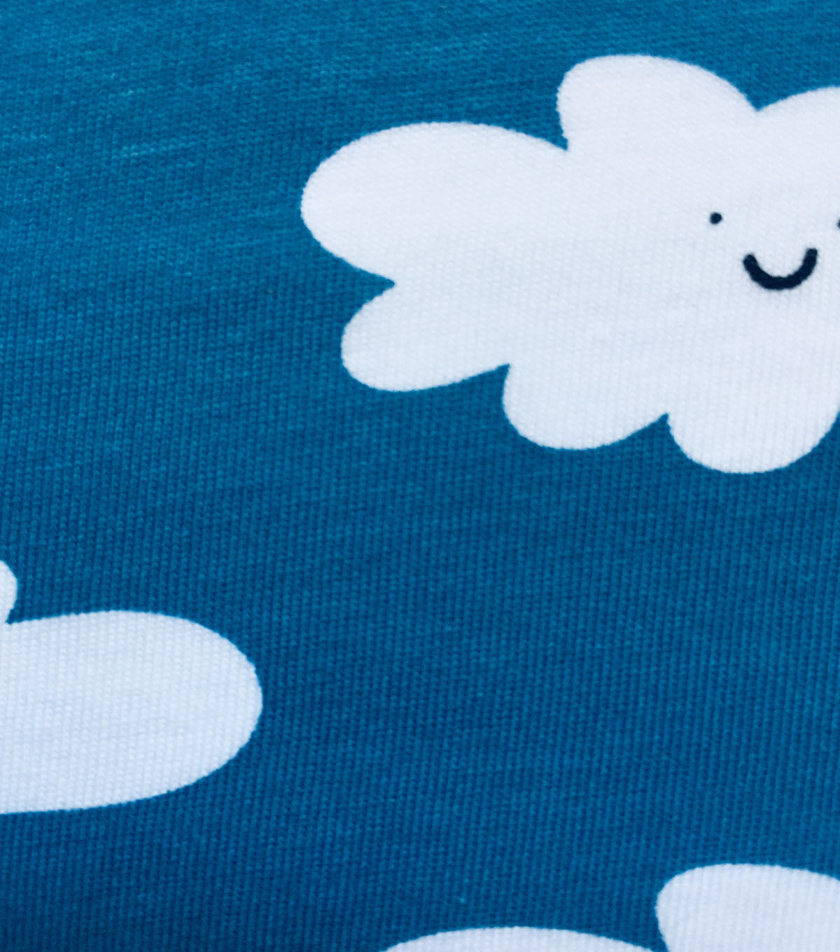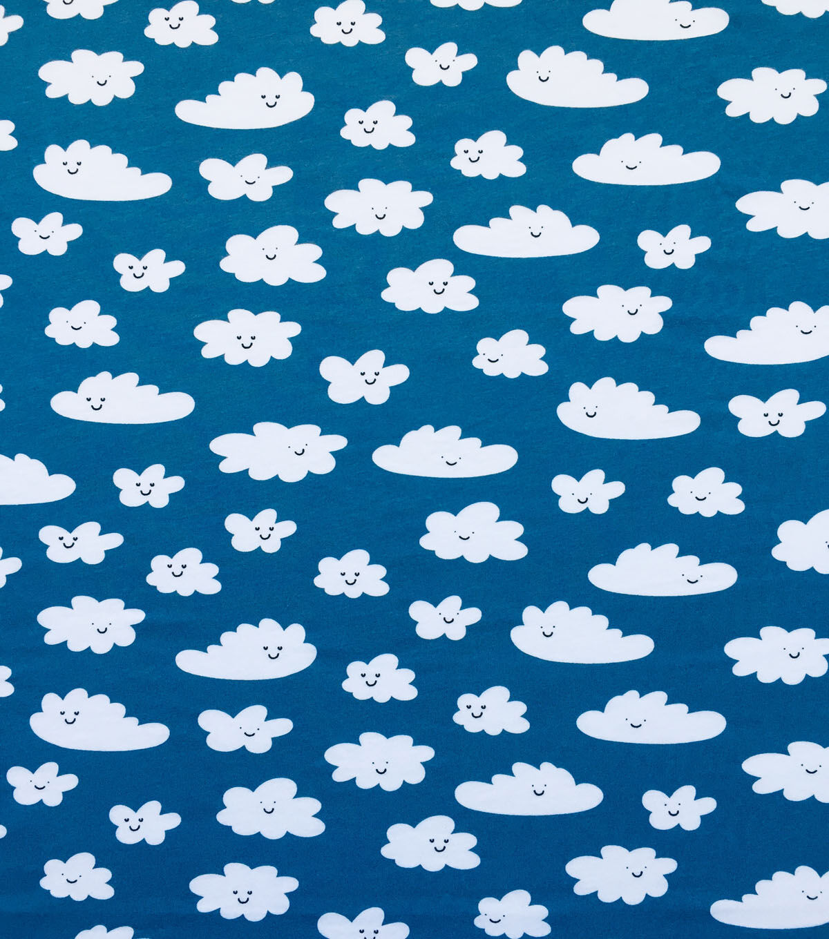 The power of cotton is an almighty force for kids attire. Our cotton jersey knit is a thinner fabric that's durable and naturally comfortable. Plus with breathability, children's tops and dresses have total freedom of movement during play time. Choose from various designs like this happy cloud pattern, and you have a loving sewing project for awesome practicality and personality.