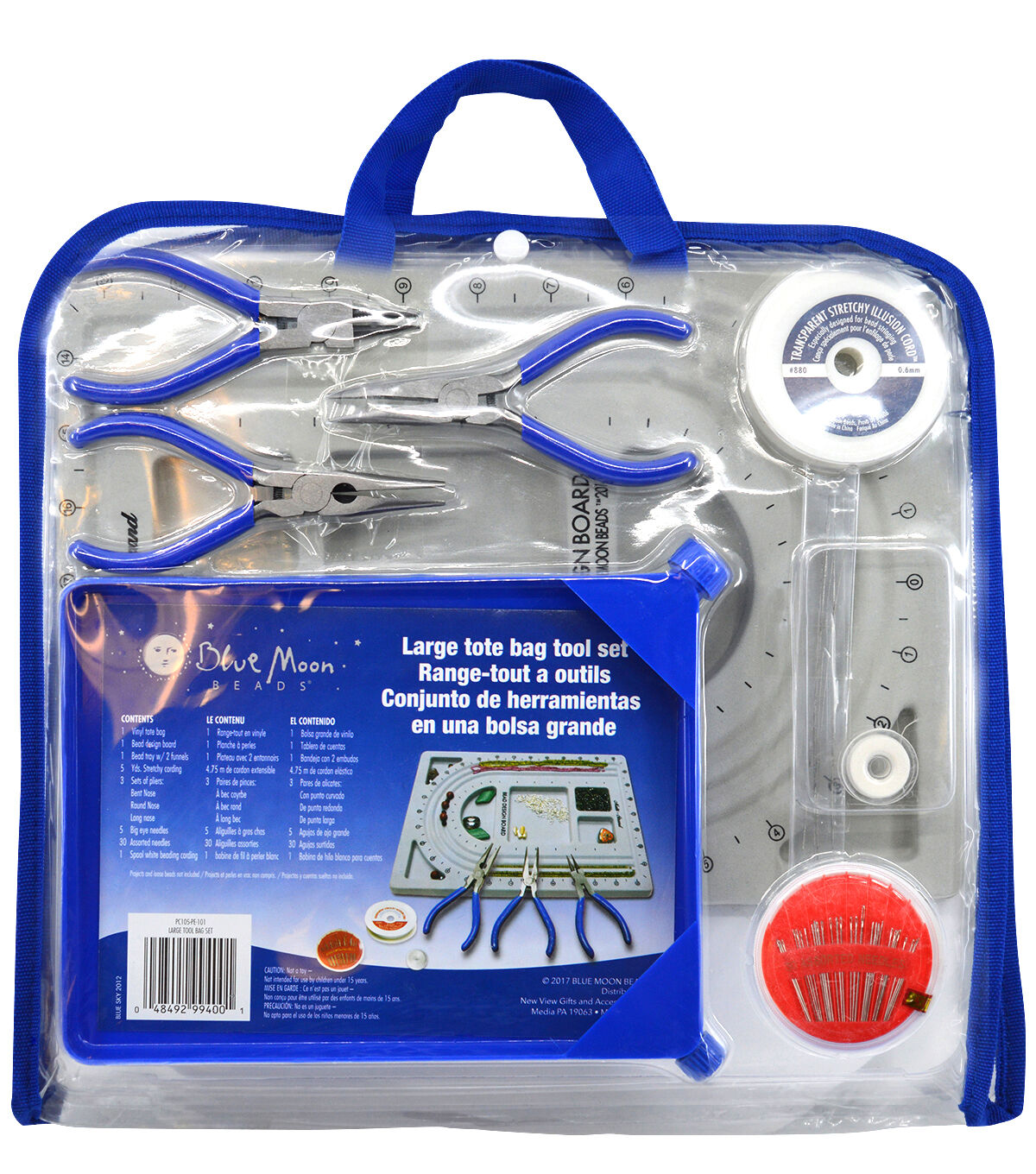 Tote/tool bag contains 1 bead board, 1 bead tray with 2 funnels, 5 yds of stretchy cording, 5 big eye needles, 30 assorted needles, 1 spool white beading cord and three pliers (bent nose, round nose and long nose). A must for every beader.