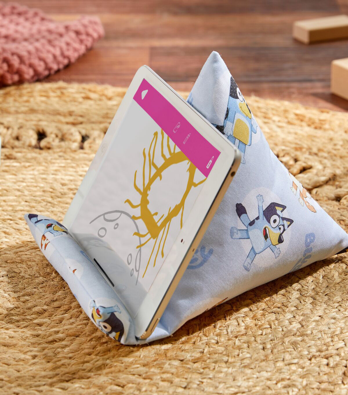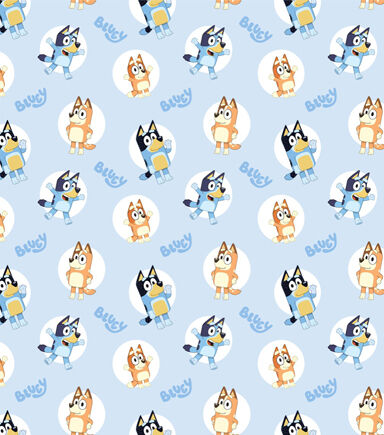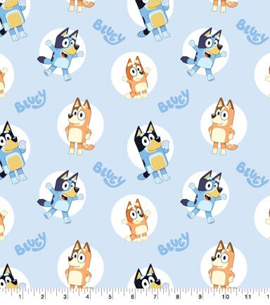 This Bluey and Bingo Badges fabric is filled with Bluey and Bingo with white circles around them. This fabric is great for beginners and advanced crafters. You could craft a throw blanket or bedding.