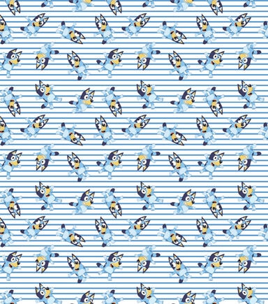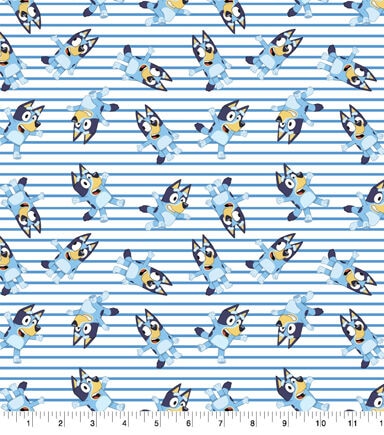 This Bluey Stripe Cotton fabric is covered with Bluey over blue and white stripes. This fabric is super soft and breathable which would be perfect for crafting a throw blanket or bedding.