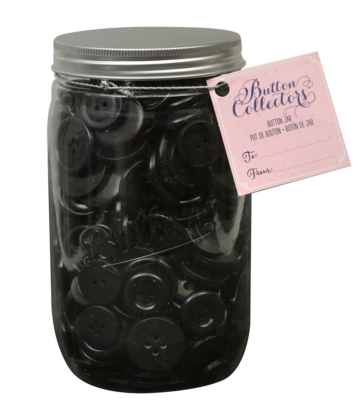 • This large mason jar with sew thru black buttons is a great value for everyday sewing, crafting projects