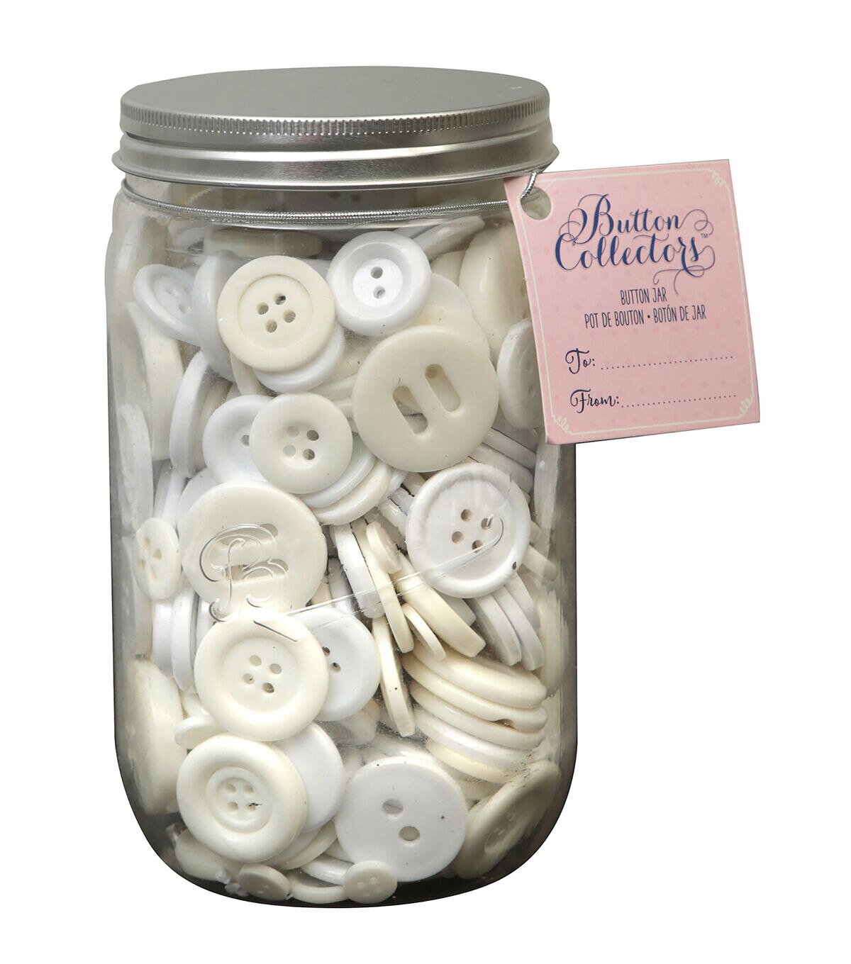 • This large mason jar with sew thru white buttons is a great value for everyday sewing, crafting projects