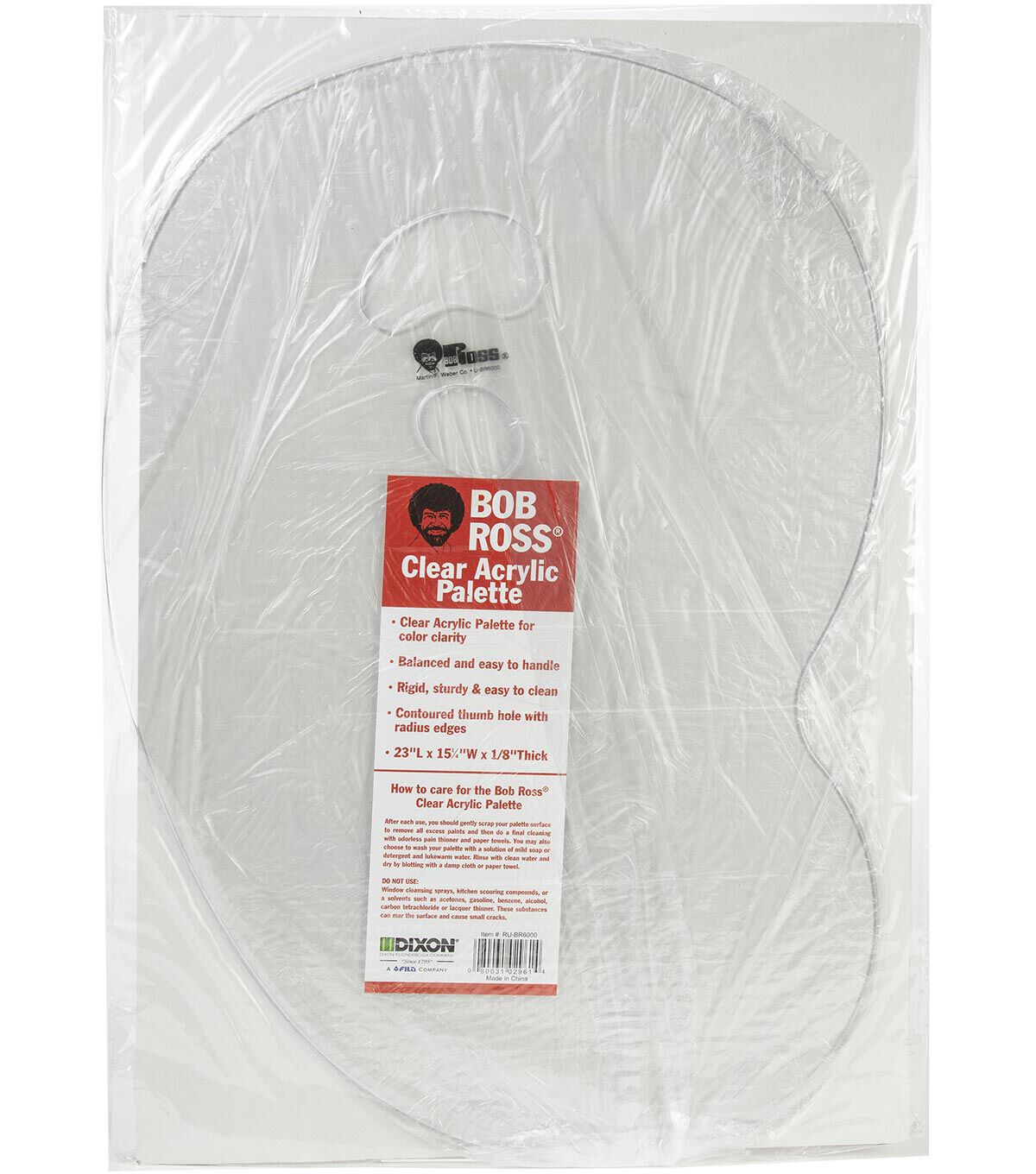 Specially designed by Bob, this sturdy clear plastic palette allows you to see true color, with smooth and roomy surface for proper loading of brushes and knives. Non-porous to prevent absorption of oil from paint: durable and lightweight. This package contains one 15.25x23 inch plastic palette. Imported.