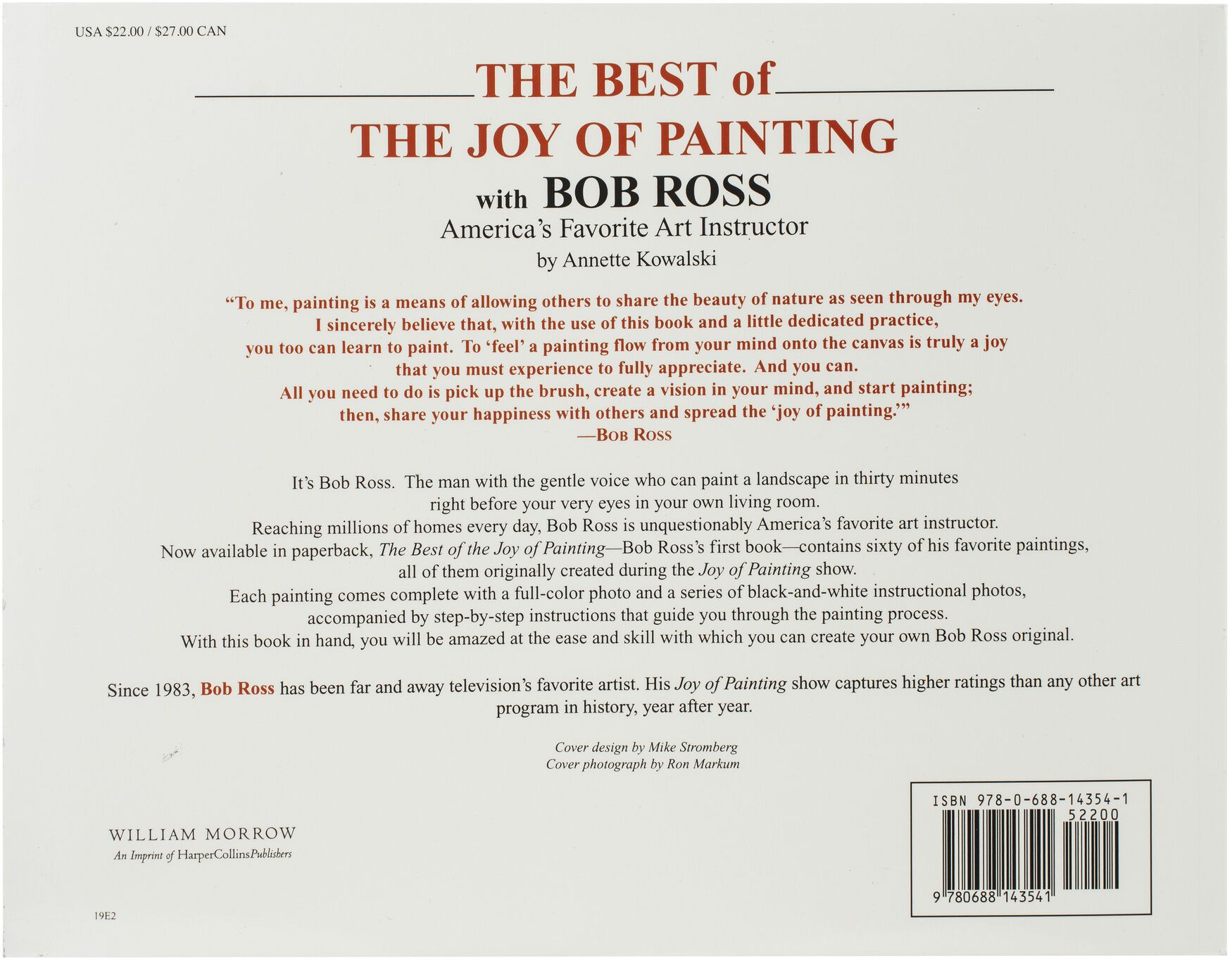The Best of the Joy of Painting book contains 60 of Bob's favorite painting projects. The book consists of an Introduction that describes the painting supplies and how they are used, a Letter To The Artist from Annette Kowalski, and step-by-step how-to photos. Also included is a Biography of the artist, Bob Ross. 256 pages. Imported.