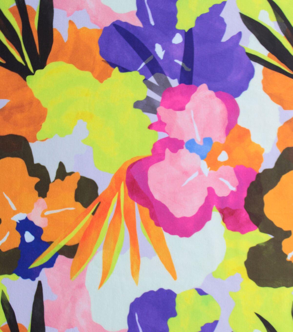 Add a pop of color and a touch of the tropics to your next sewing project with our Bold Tropical Abstract Knit Fabric. This vibrant fabric features a stunning abstract design in shades of green, blue, and pink, perfect for creating eye-catching apparel or home decor. The knit fabric is soft and stretchy, making it comfortable to wear and easy to work with.