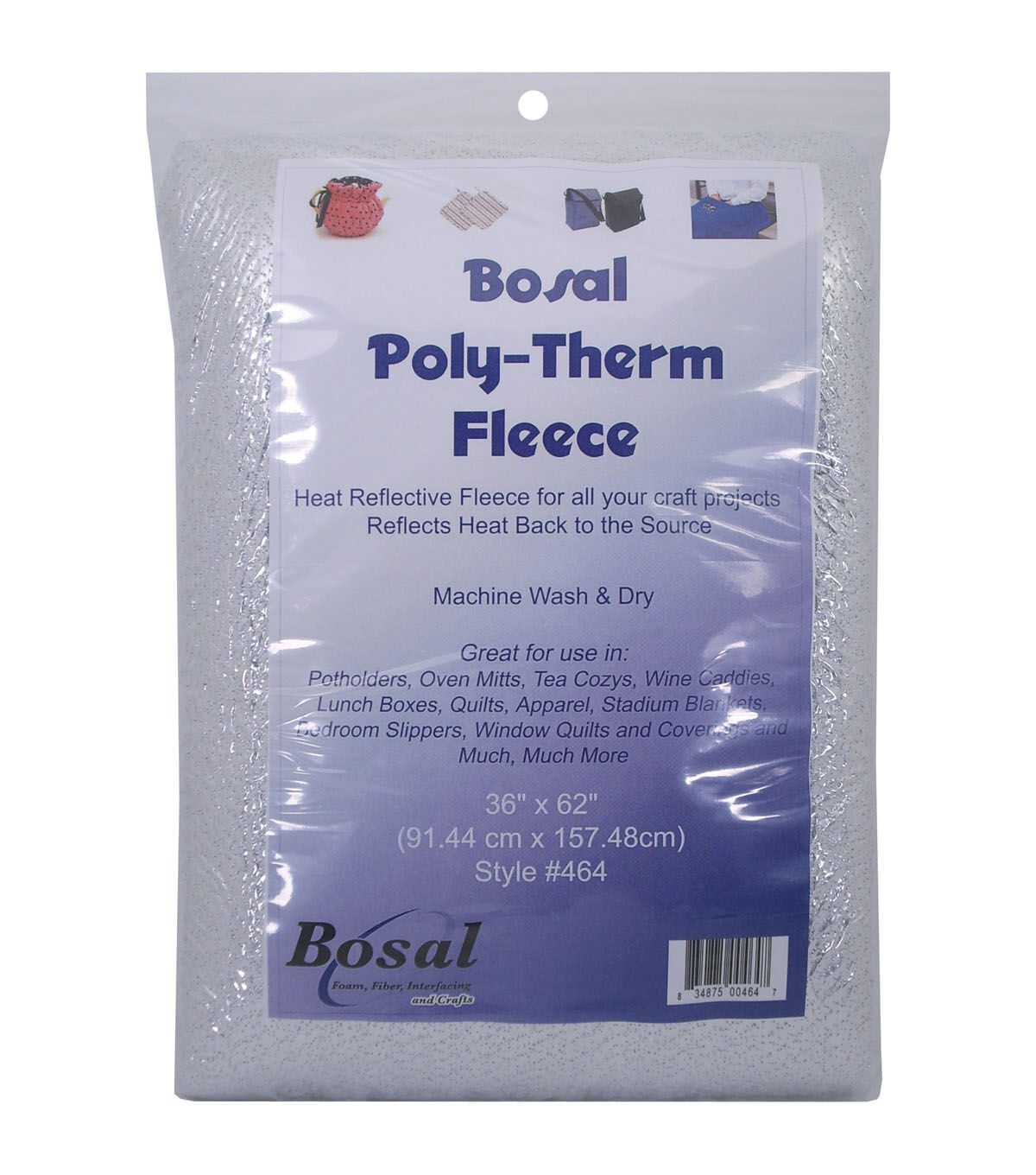 The Bosal Poly-Therm Heat Reflective Fleece-Silver is perfect for a variety of home crafting needs like pot holders, oven mitts, tea cozies, wine caddies, lunch boxes, quilts, apparel, stadium blankets, slippers, window covering and much more. It is made of 100% polyester fleece and 100% polyethylene film. The white fleece on one side allows for machine or hand quilting with the dimensional effects we love, and the silver lining on the other side actually reflects heat back to the source allowing for use in homemade coolers and warmers. In order to use as hot mitts or pot holders, a layer of cotton batting is recommended as a shield between the outer fabric and the Poly-Therm Fleece, as extreme heat will melt the fleece and film. This pack contains one 62 x 36-inch piece of reflective fleece.