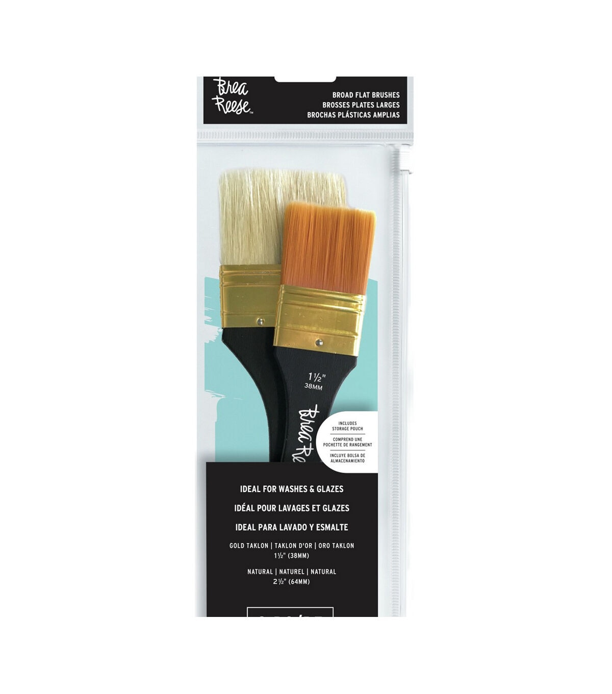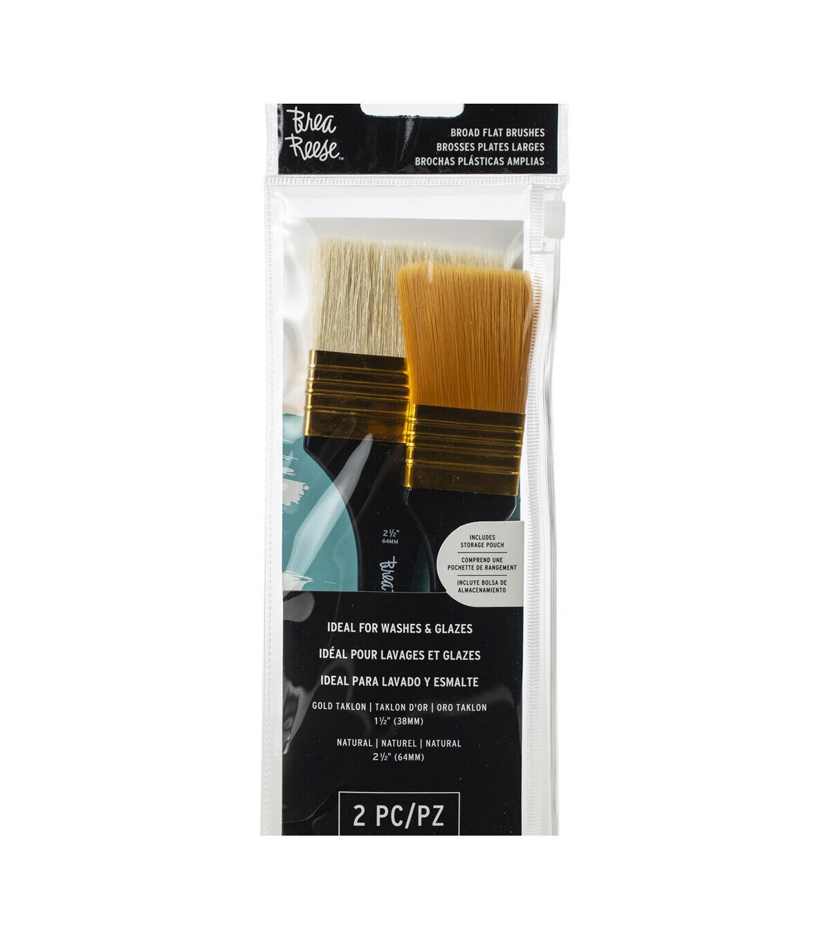 The brushes have professional-grade bristles that are perfect for a variety of projects. This 4x10.75 inch package contains two broad, flat brushes (Gold Taklon 1.5 and Natural 2.5) in one clear, zippered storage pouch. Imported.