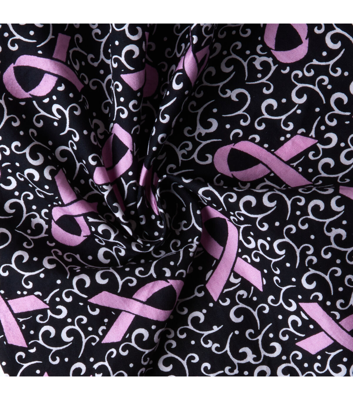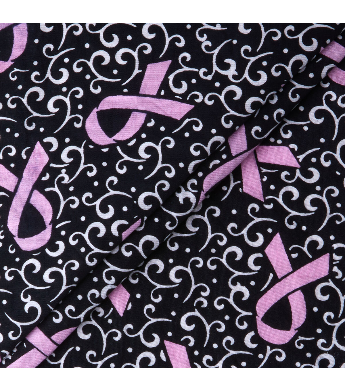 • Breast Cancer Ribbons & Swirls Black Batik Cotton Fabric