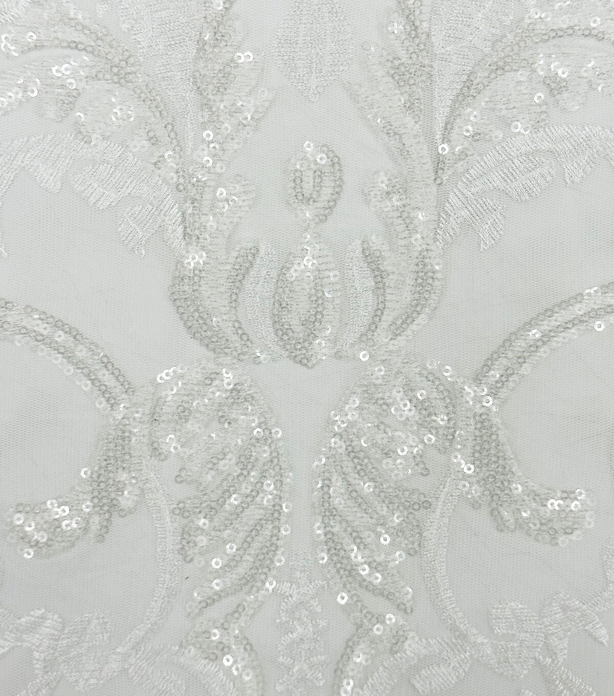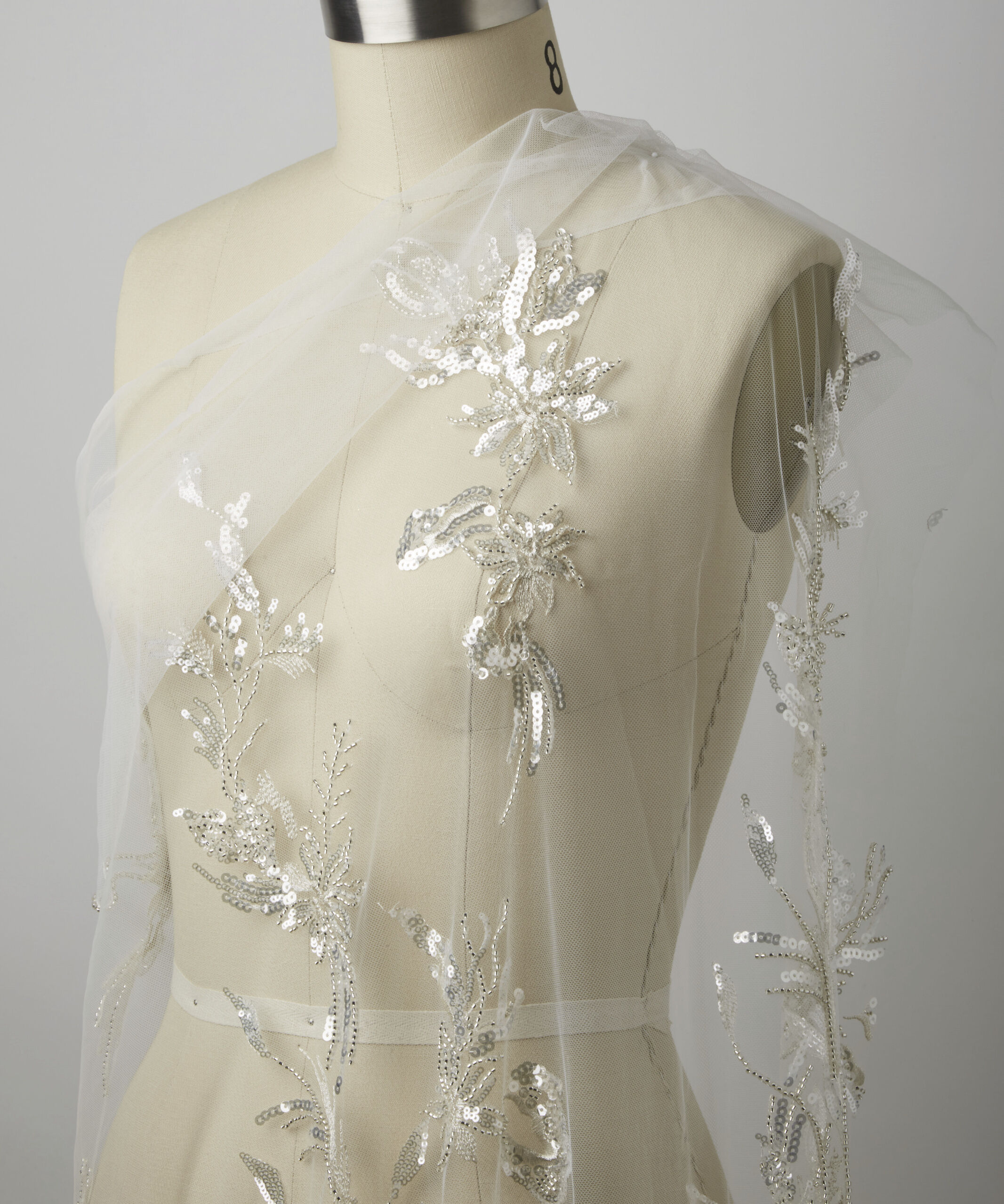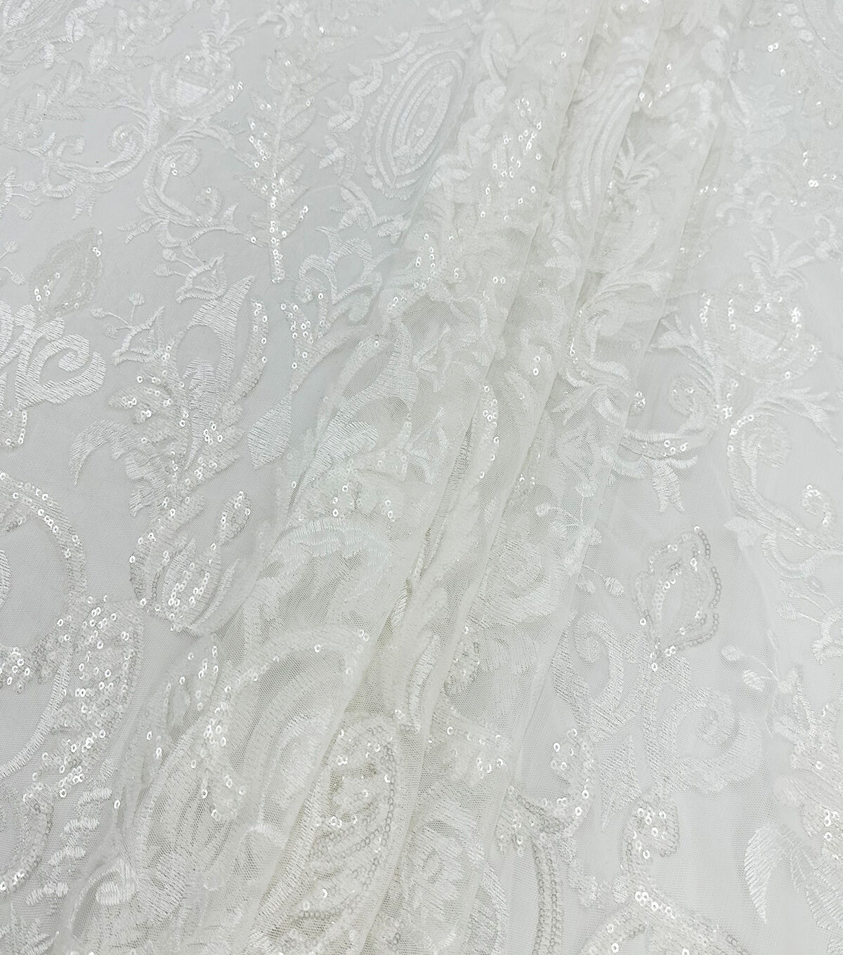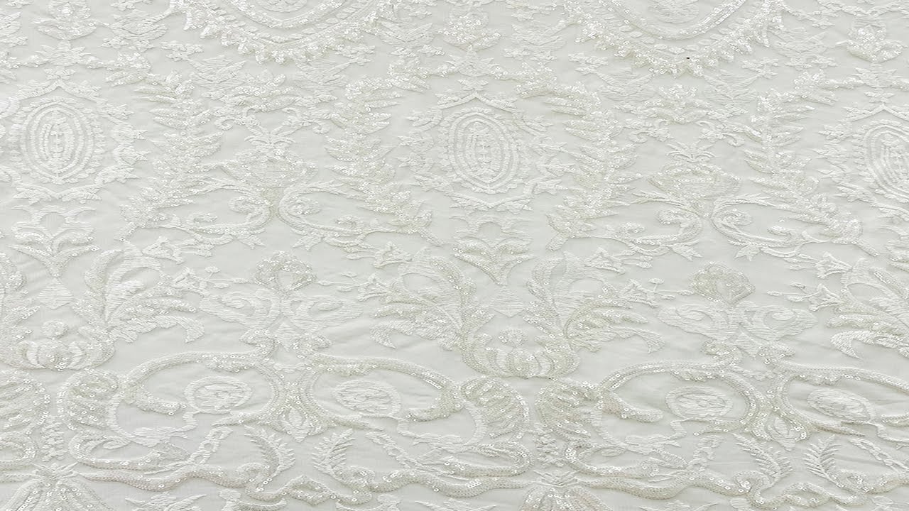 Our sequin embroidery fabric adds a large floral and sparkly design with a transparent effect. Made of 100% Polyester, this material is durable and breathable so you don't have to worry about any wardrobe malfunctions and simply look your beautiful best. It's all eyes on you for the big day, and our bridal fabrics are here for you to stun the crowd.