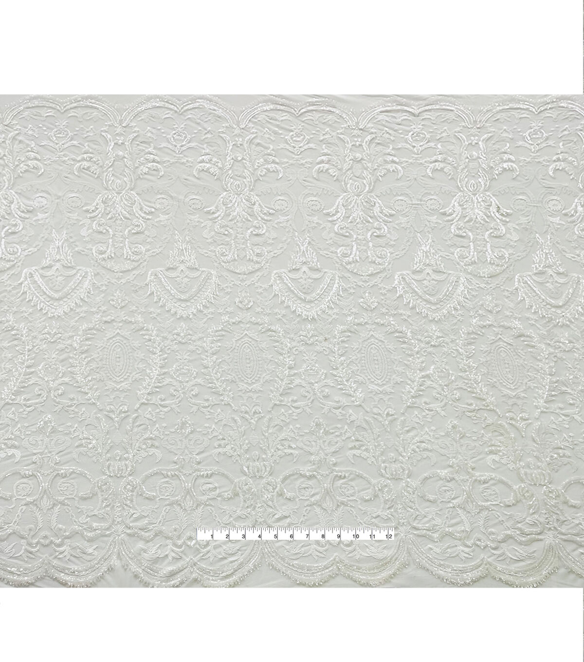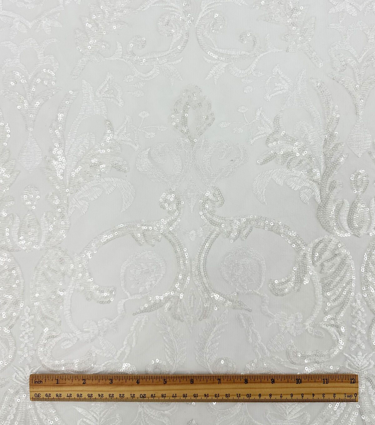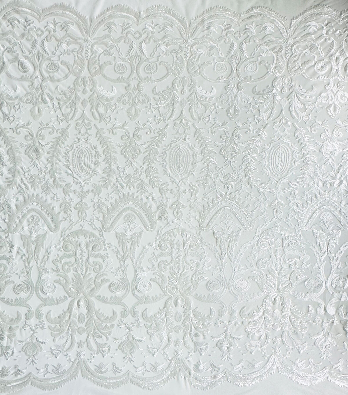 Our sequin embroidery fabric adds a large floral and sparkly design with a transparent effect. Made of 100% Polyester, this material is durable and breathable so you don't have to worry about any wardrobe malfunctions and simply look your beautiful best. It's all eyes on you for the big day, and our bridal fabrics are here for you to stun the crowd.
