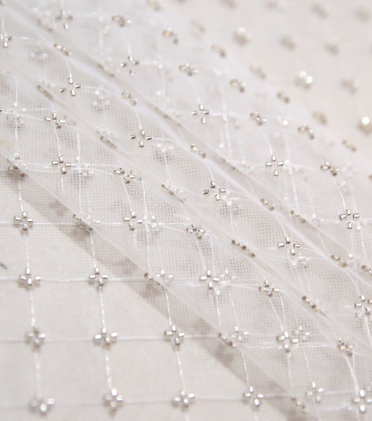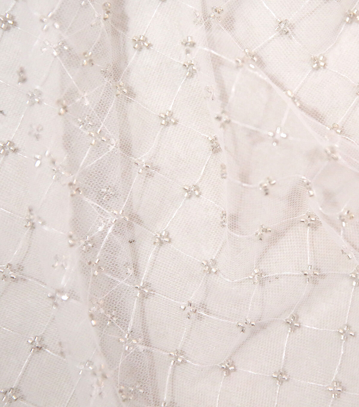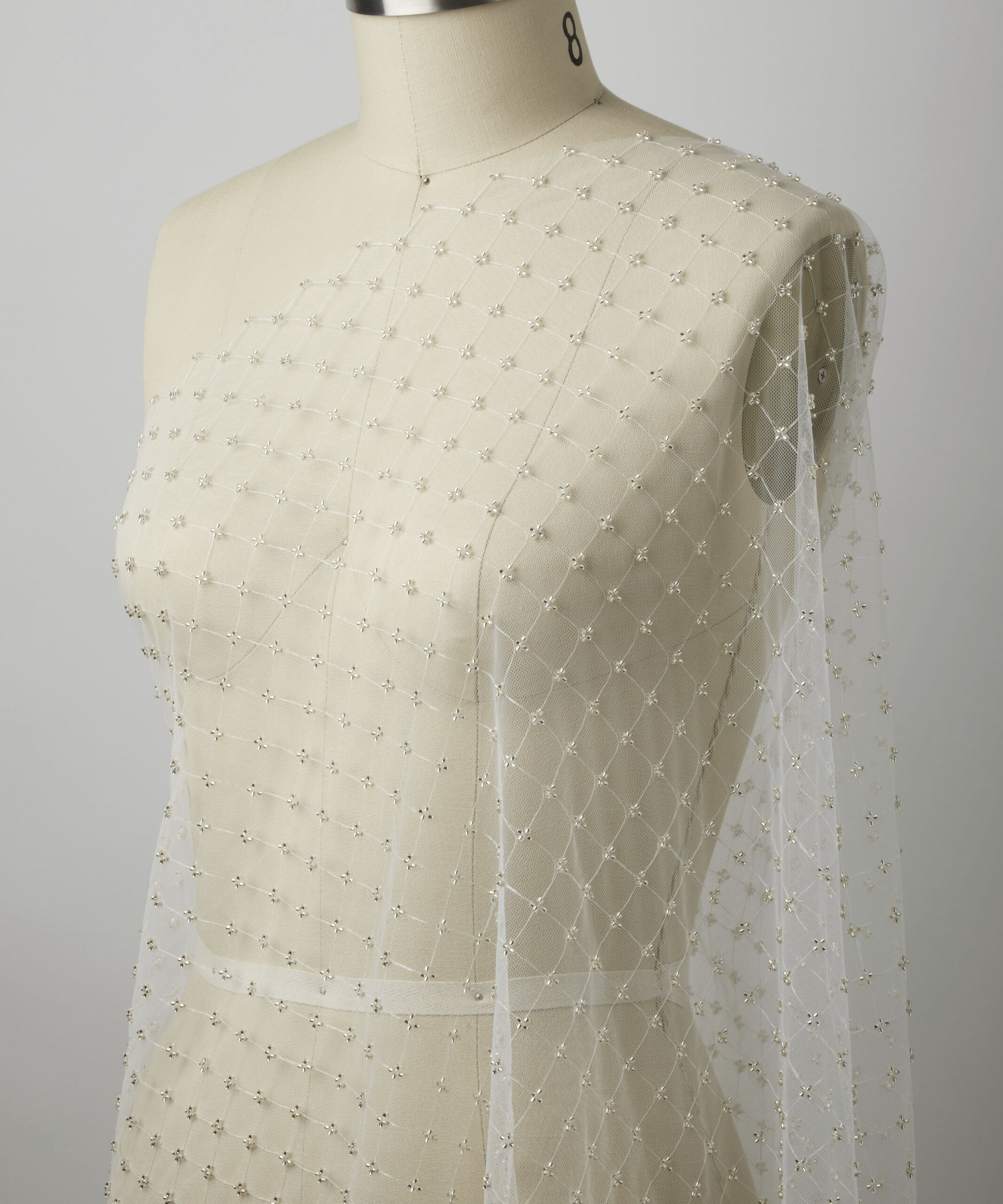 Our trellis bead embroidery fabric is minimalistic shine and noble pattern for wedding attire. Made of 100% Polyester, this material is durable and breathable so you don't have to worry about any wardrobe malfunctions and simply look your beautiful best. It's all eyes on you for the big day, and our bridal fabrics are here for you to stun the crowd.