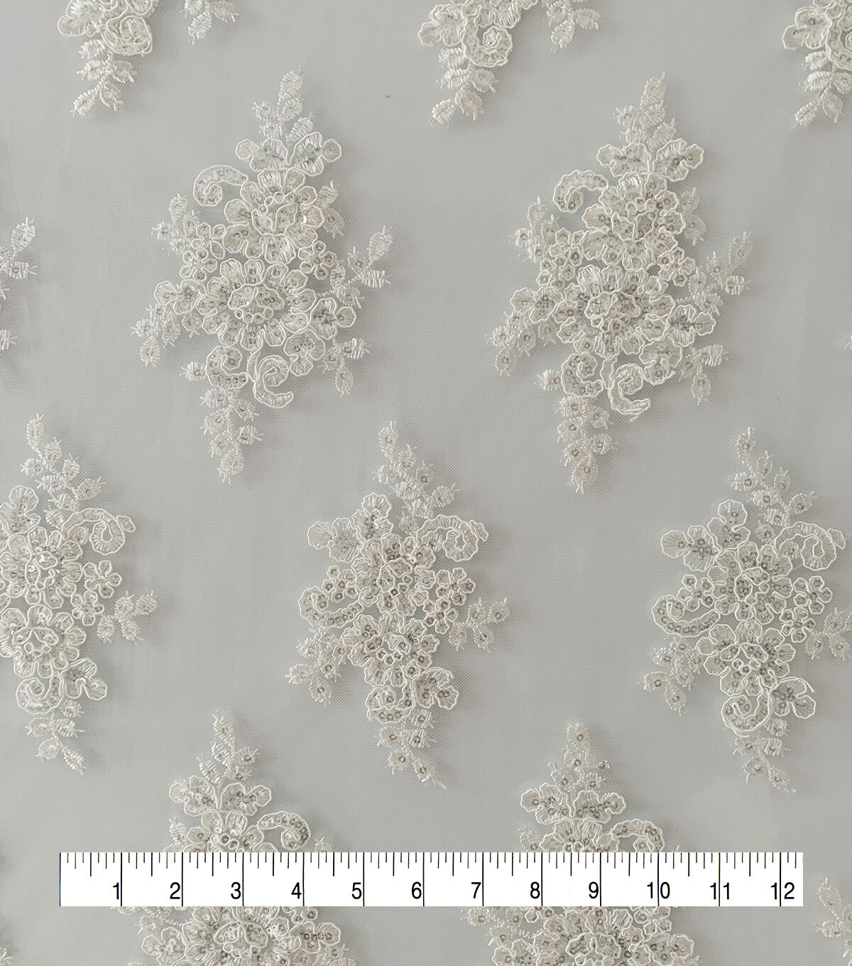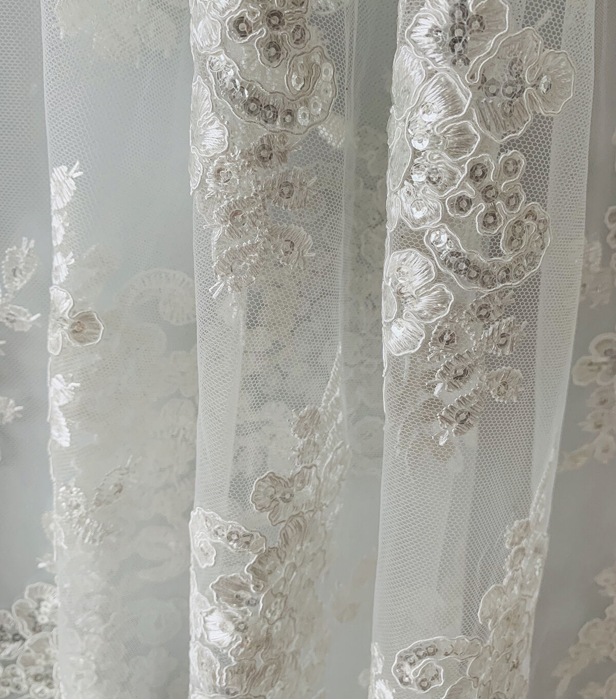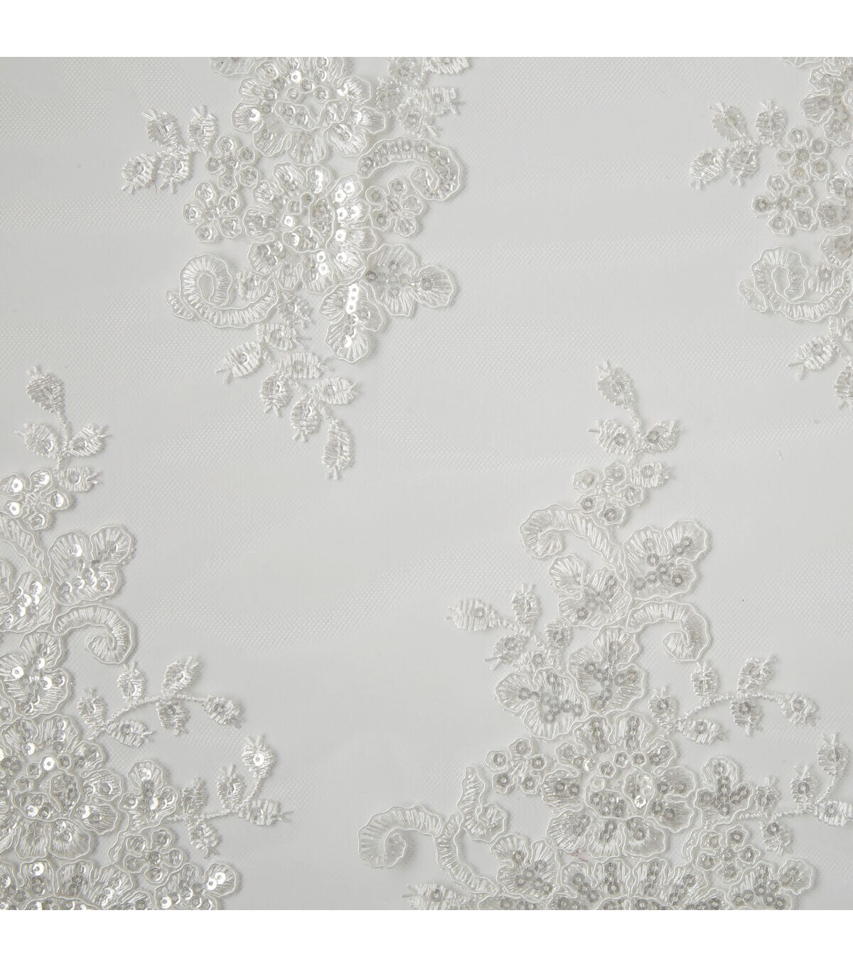 Our white mesh fabric adds big sequined designs on transparent background for wedding accents. Made of 100% Polyester, this material is durable and breathable so you don't have to worry about any wardrobe malfunctions and simply look your beautiful best. It's all eyes on you for the big day, and our bridal fabrics are here for you to stun the crowd.