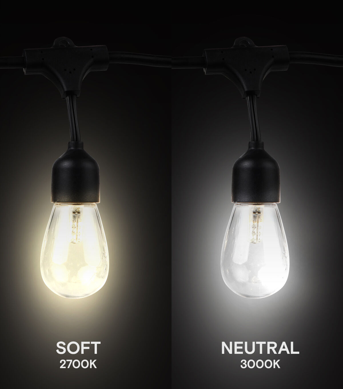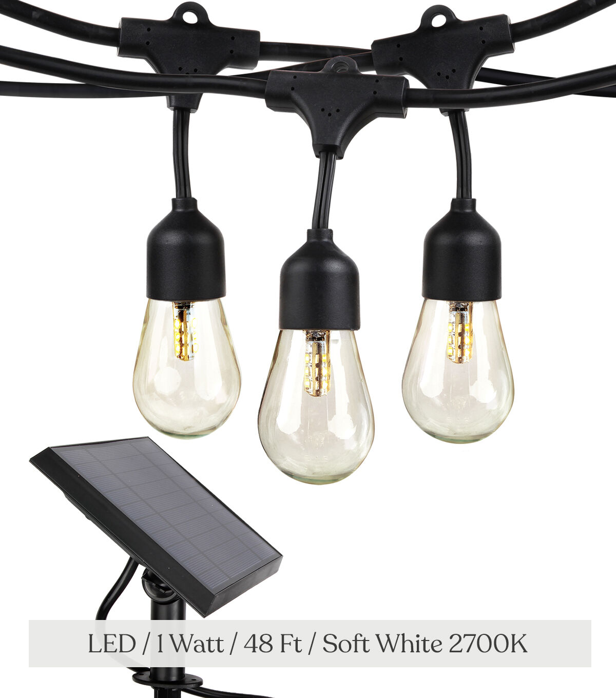 Brightech's Ambience Pro Solar String Lights creates a beautiful backyard atmosphere where you can sit back, relax, and enjoy your evening. These Edison-style string lights give off a warm, nostalgic glow so you can come home after a busy day and enjoy your very own retreat. They feature our standard high-efficiency shatterproof LED S14 1W plastic bulbs (with heat resistance up to 122 degrees Fahrenheit) and our rubberized flexible cord that is thicker than traditional rope. The 27-foot lights feature 12 bulbs spaced 20-inches apart, whereas the 48-foot lights feature 15 bulbs that are spaced 3-feet apart, both with the capacity to connect up to 8 strands. With 6 feet from the solar panel to the first bulb and an additional 3 feet at the opposite end, our lights can offer the flexibility you need to fit the dimensions of your space. Our lights also feature a detachable solar panel with an on/off switch located on the back. The built-in photocell senses light, turning on your lights automatically at evening time so that you can enjoy your beautiful outdoor lights without any of the hassles. Our lights last 5-6 hours on a full charge. Indirect sunlight may provide some charge as well. Thanks to Brightech's WeatherTite (TM) technology, these gorgeous lights are waterproof/weatherproof to a commercial grade. Include the perfect glow to your evening when entertaining your guests, or add that romantic touch to your dinner date.
