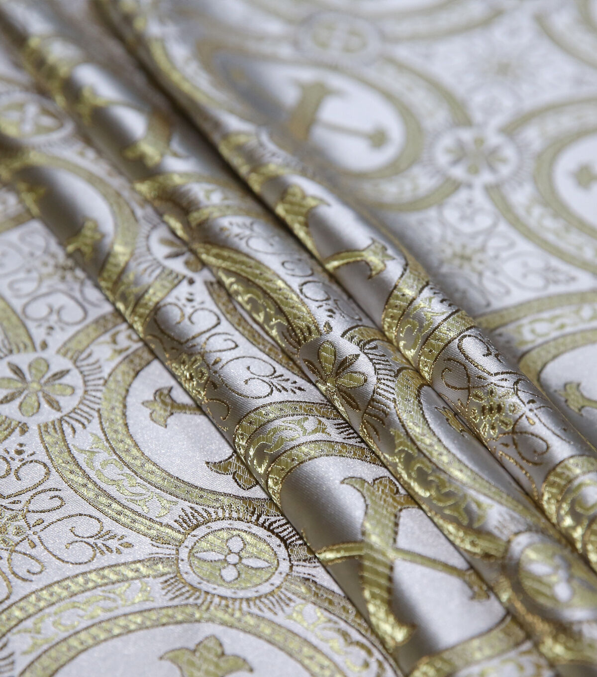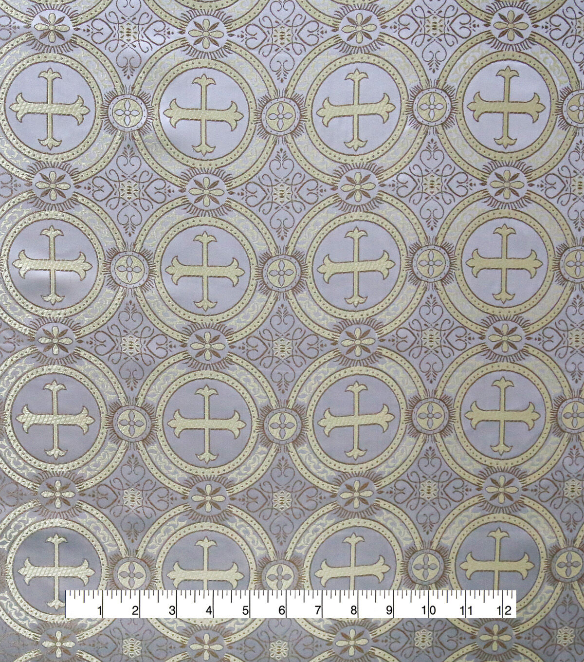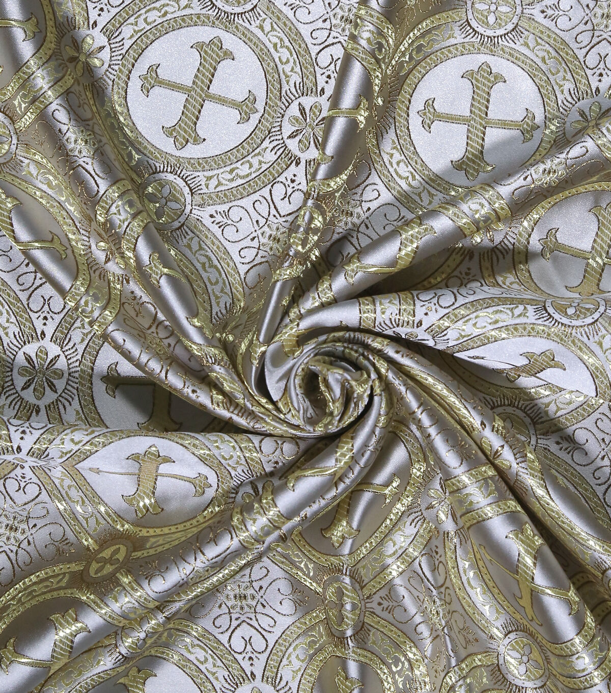 Add a golden design to spruce up your look with our gold cross brocade. This fabric is blended with polyester and nylon for a combination of durability, stretch and form-fitting capability. Plus it has a nice drape that works wonderfully for tops, dresses and more. Grab this design for a unique, vintage look for special occasions, or even cosplaying! Grab it for tons of sewing opportunity!
