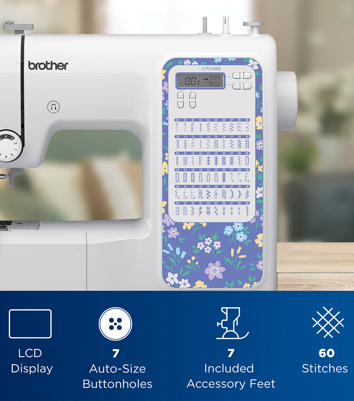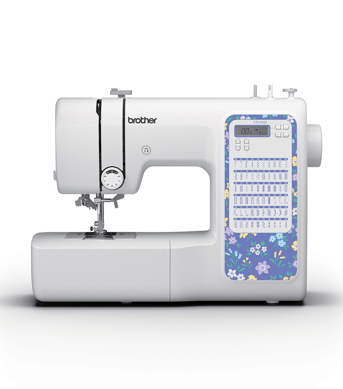 Enjoy a full range of features in a compact, durable and lilac floral footprint with the CP2160L computerized sewing machine. The CP2160L comes with 60 built-in stitches, seven auto-size one-step buttonholes, and selecting one of the attractive built-in stitches is as simple as pressing a button with the easy stitch selector. A sharp LCD screen and advanced needle threading system, which makes threading easy, add to the machine's highlights. Utilize drop feed dogs and try free-motion sewing or the free arm capability to make sewing cuffs, sleeves, and skinny jeans a breeze. The CP2160L allows for virtually effortless sewing on denim, tweed, and other thick fabrics with the exceptional feed system and fixed needle bar. Also included are seven first-rate sewing feet (a Zigzag foot, a Buttonhole foot, a Zipper sewing foot, a Button sewing foot, Overcasting foot, Blind stitch foot, and a Monogramming foot) to help you achieve a variety of sewing techniques. Complete with a Quick-Set bobbin and a super bright LED-lit work area, the affordable CP2160L will have you creating DIY projects and garments in no time.
