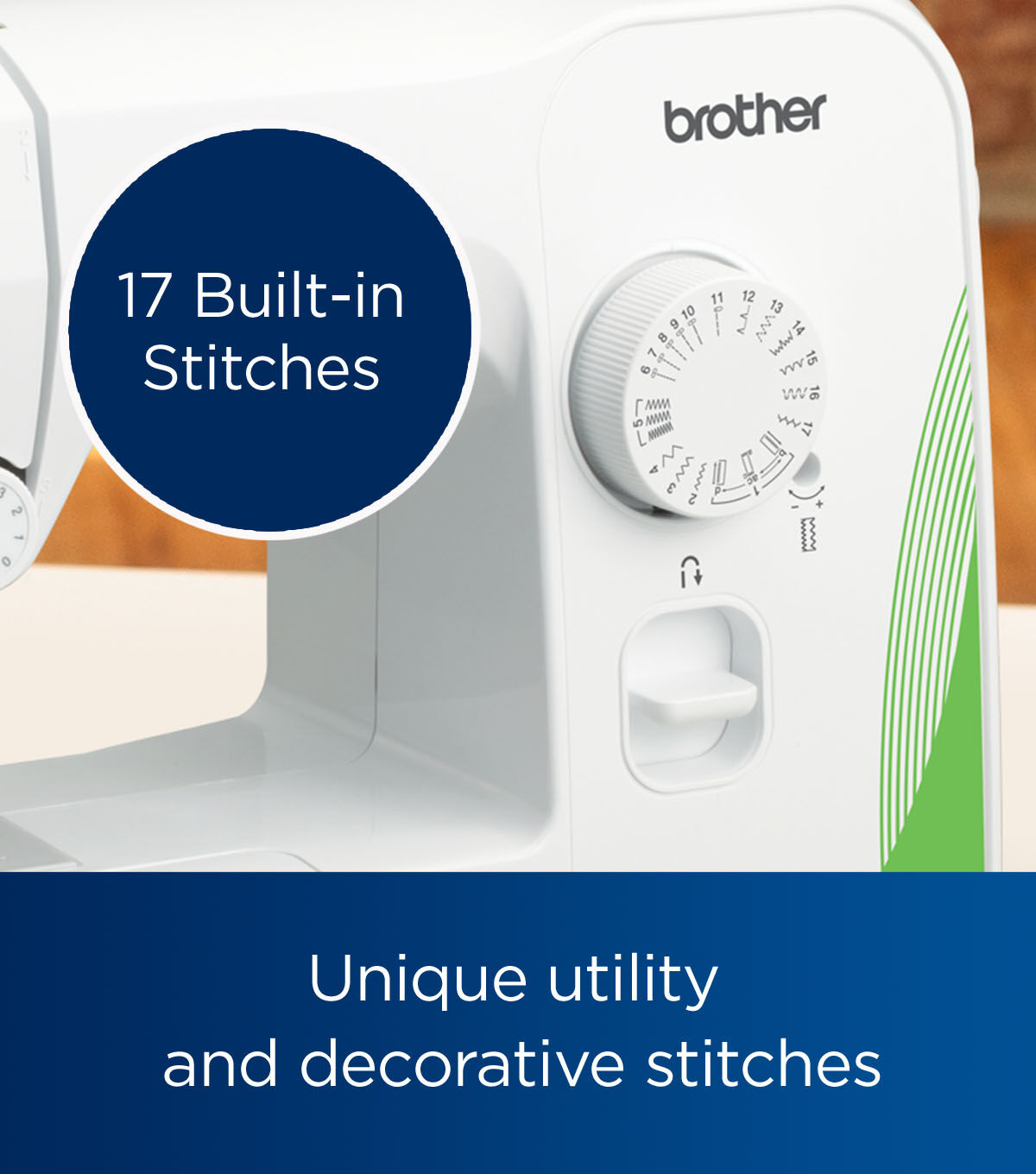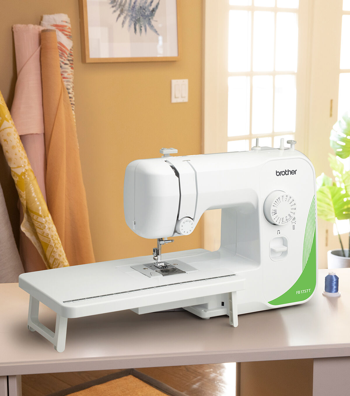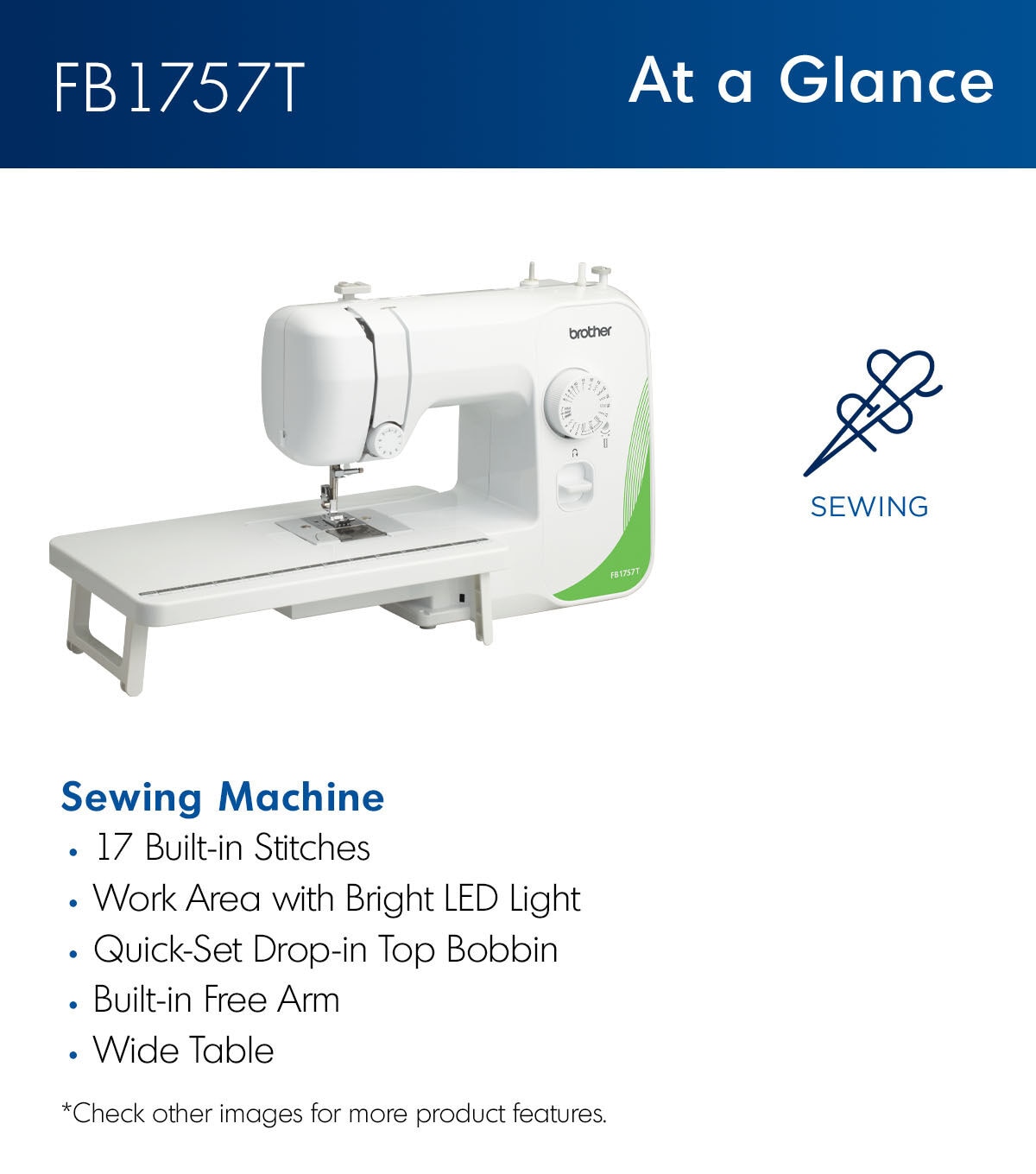 The FB1757T handles basic sewing and mending and is easy to use. Built-in are 17 unique utility and decorative stitches and an included 4-step buttonholer. This model also features a jam-resistant drop-in top bobbin and a brightly lit LED work area.