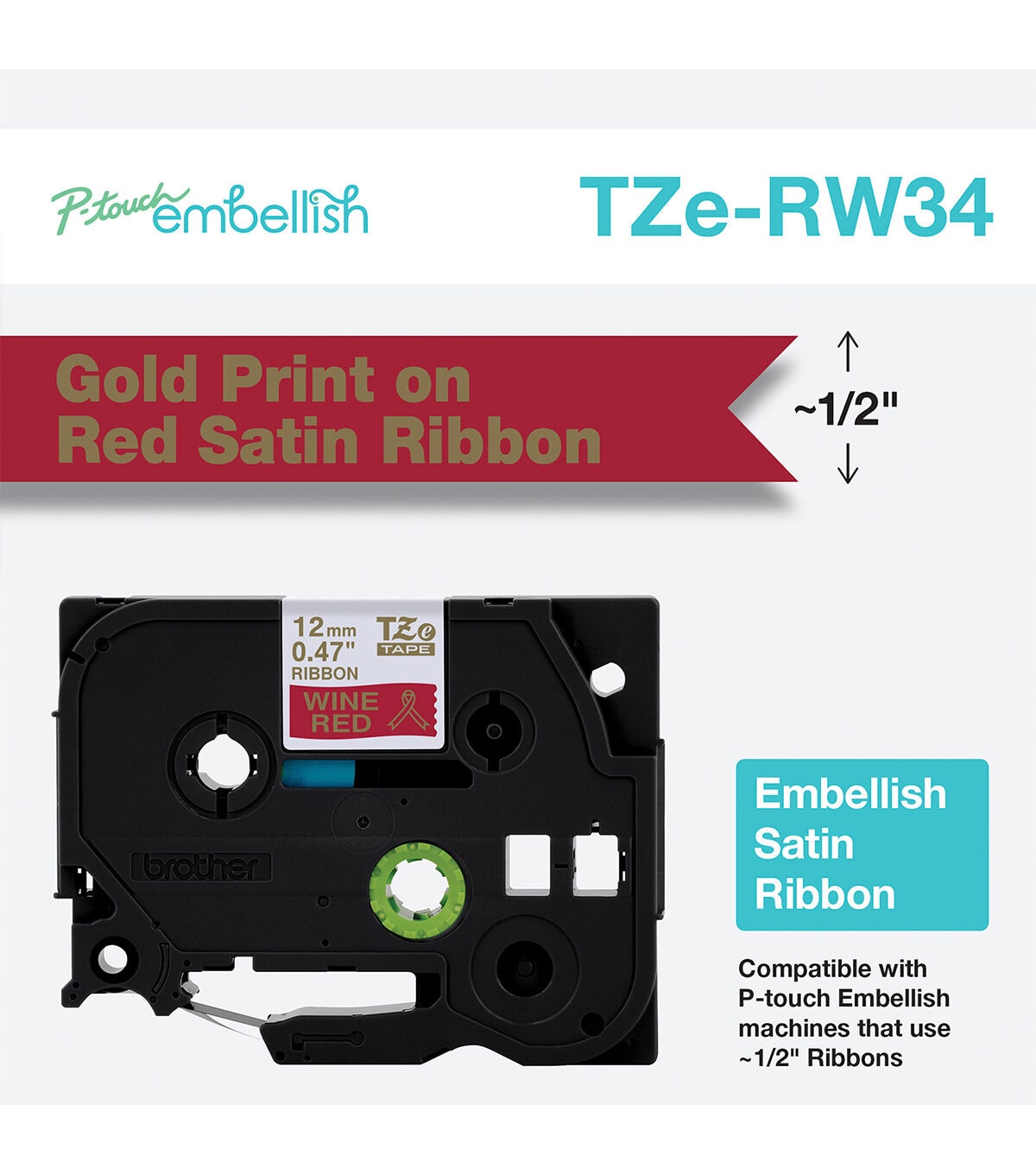 - P-touch Embellish Gold Print on Red Satin Ribbon TZe-RW34 is perfect for adding your own elegant, decorative touch to gift-wrapping, party favors, home décor, scrapbooking, craft projects and much more.