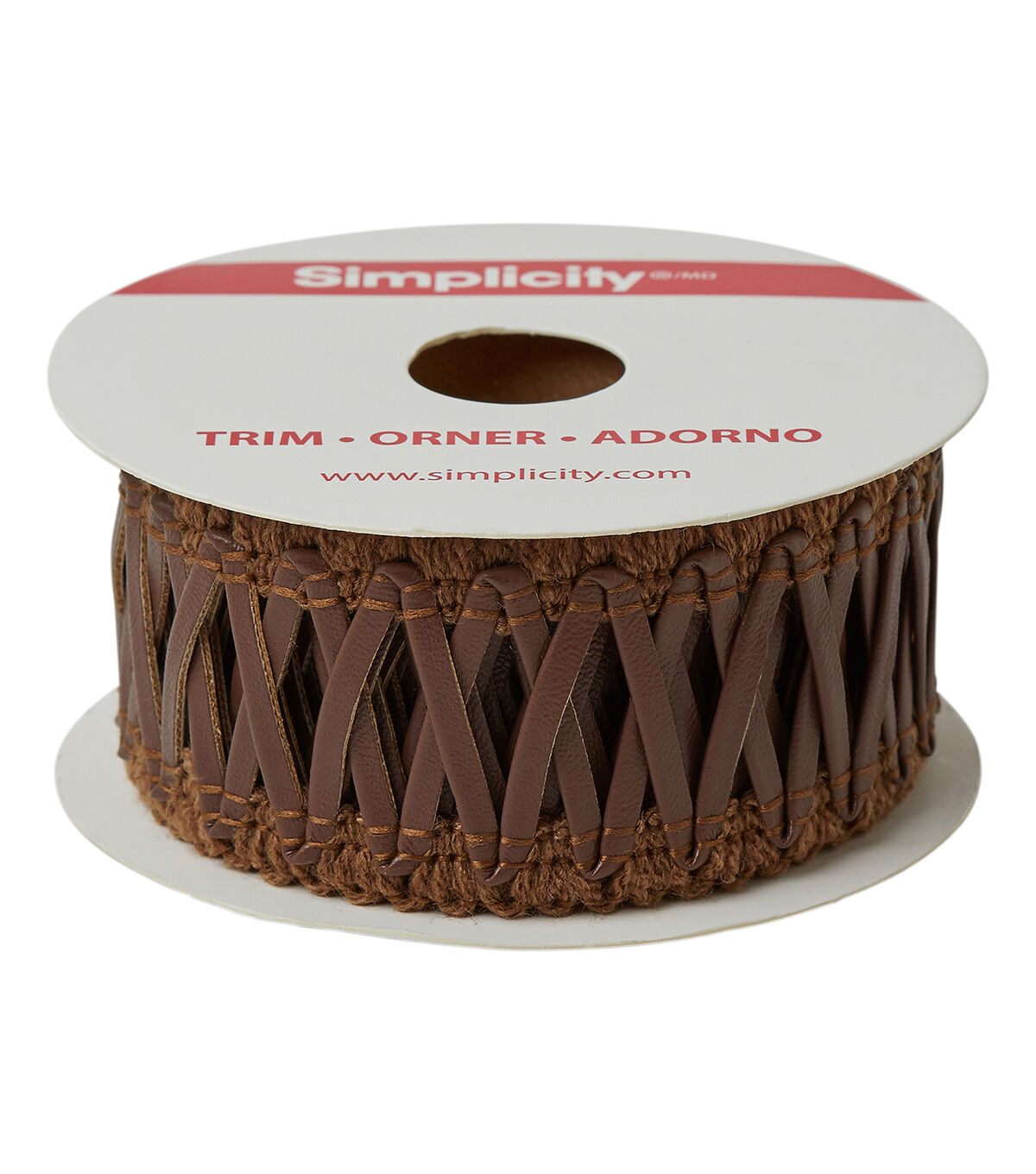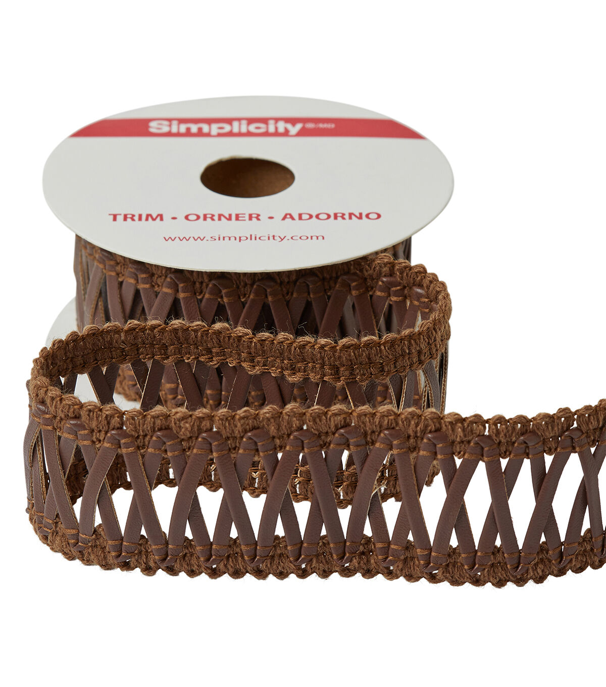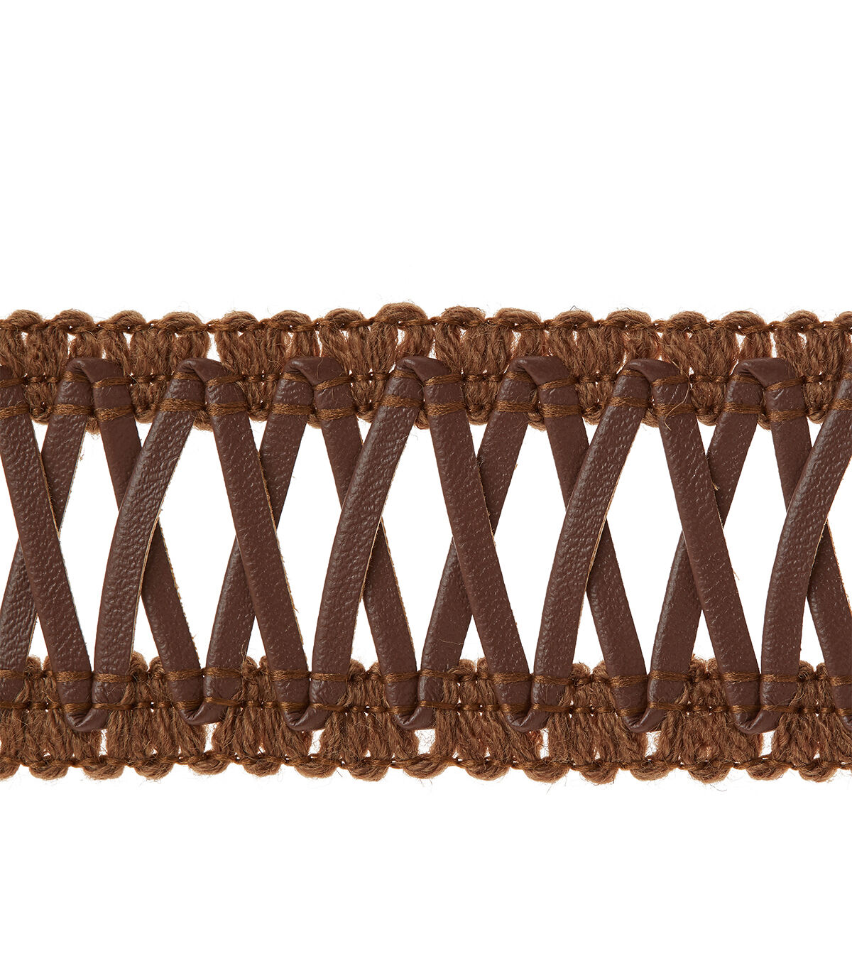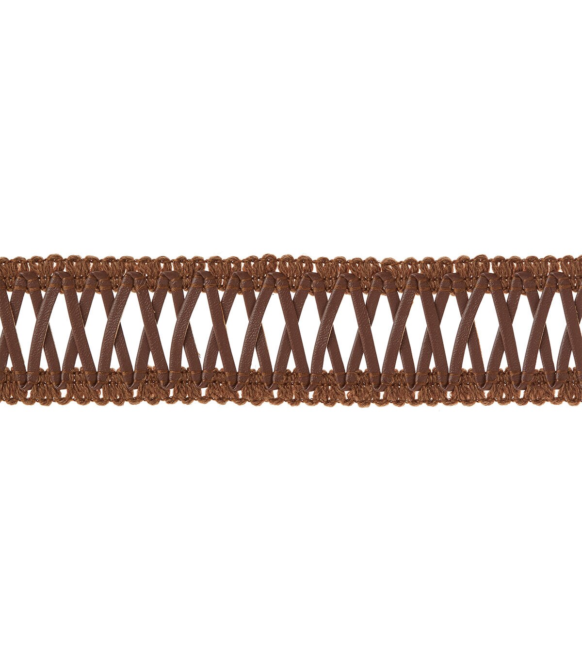 This 1 3/8 inches in brown cross lacing in a polyester/polyurethane blend. Use this easy trim for apparel design, home décor inspirations and so much more!