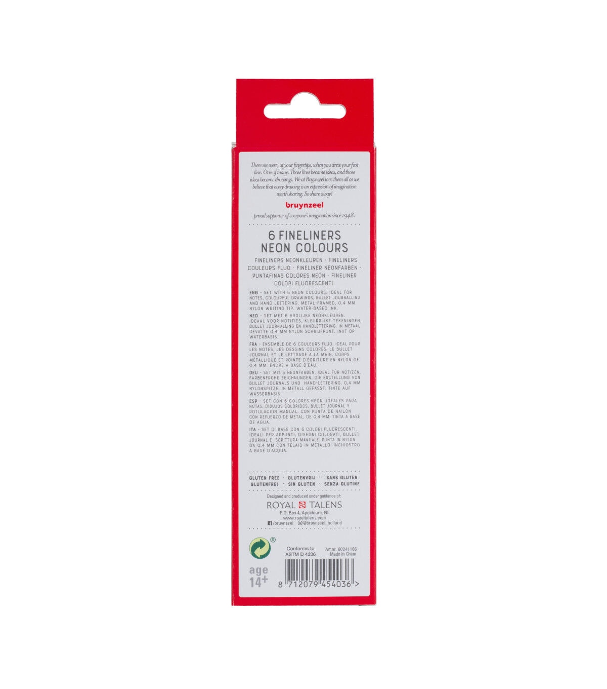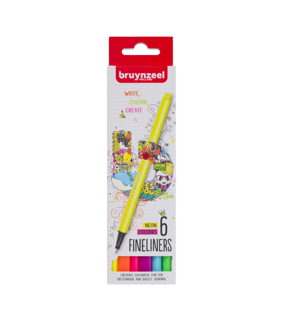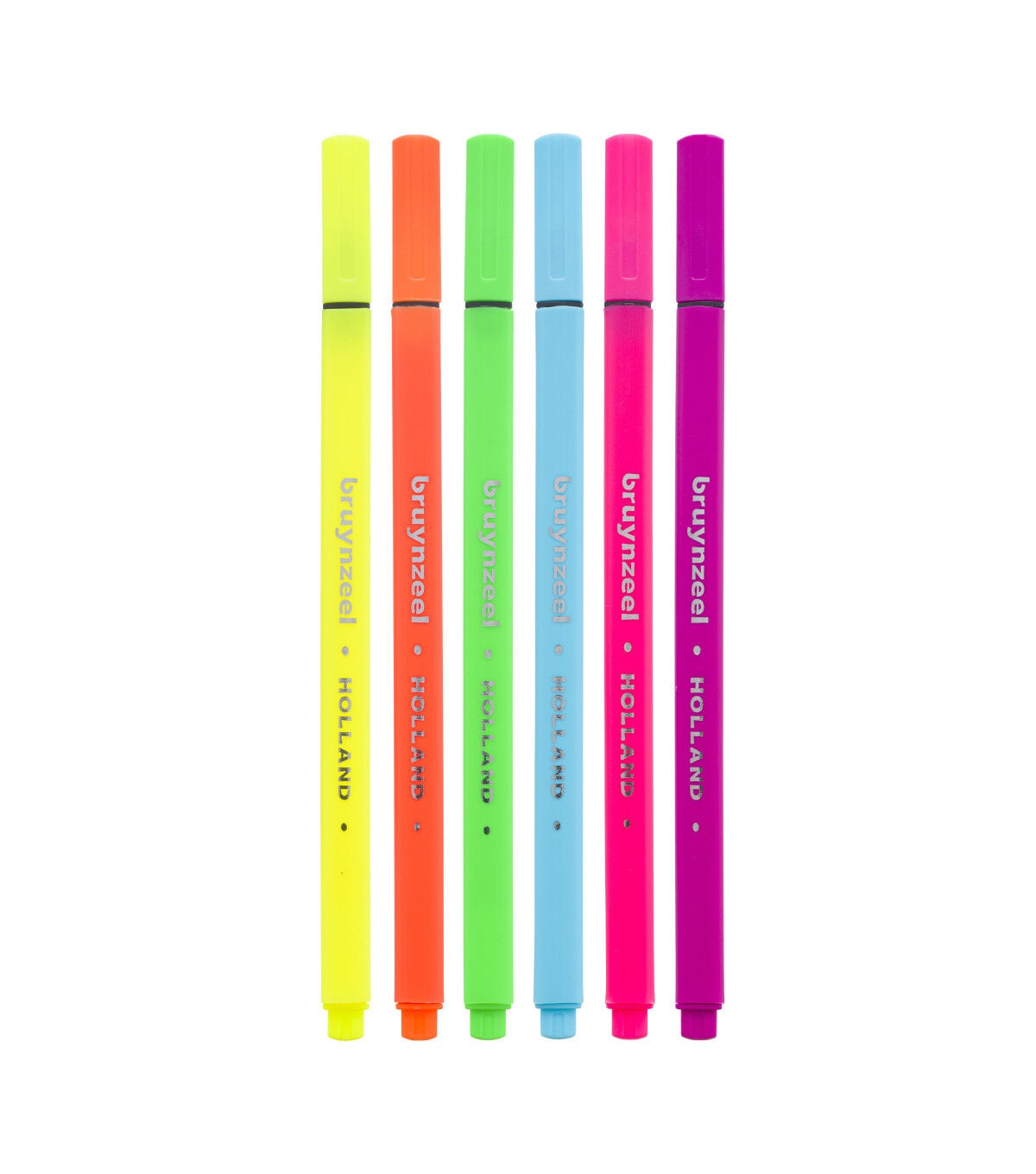 Fineliner Pens from Bruynzeel are ideal for writing notes, drawing, bullet journaling and hand lettering. They feature metal-framed .4mm nylon writing tips. The 6-Pen Neon Colors Set includes fluorescent yellow, aqua blue, spring green, light orange, pink and purple.