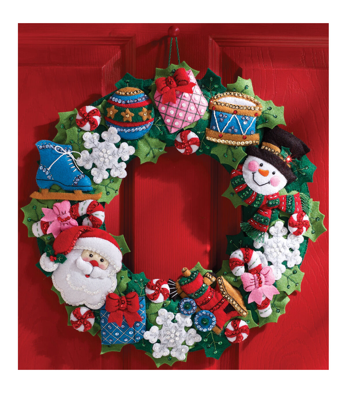 Combine your favorite Christmas embellishments and create a traditional decorative wreath with the Bucilla Wreath Felt Applique Kit. Bright colors infuse holiday charm while little accents add a festive touch to your decor. This wreath kit includes everything from stamped felts to sequins and beads to help you create a beautiful holiday piece.