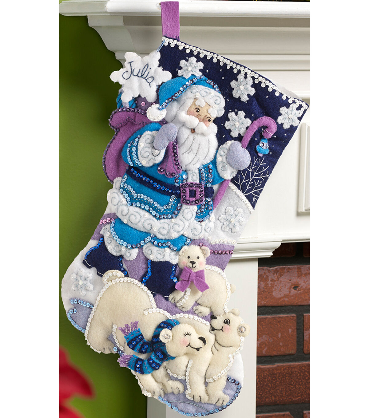 Bucilla-Stocking Felt Applique Kit. Festive designs, quality materials and generous embellishments continue to make Bucilla felt kits a favorite stitchery tradition. This package contains stamped felts, cotton floss, color separated sequins and beads, two needles and instructions. Design: Artic Santa. Finished dimensions: 18 inches long. Made in USA.